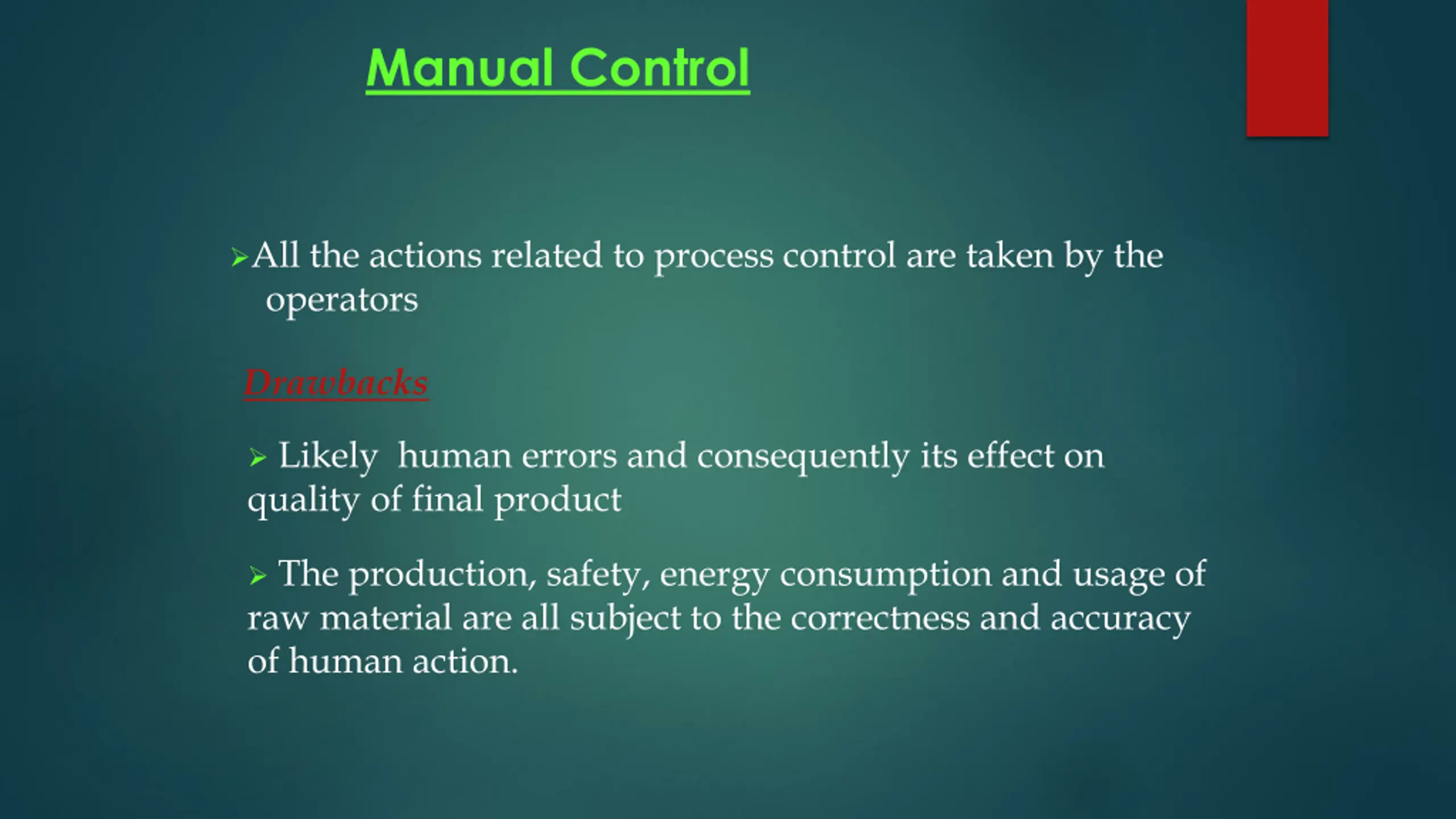 Manual Control All the actions related to process control are taken by the operators Drawbacks Likely human errors and consequently its effect on quality of final product The production, safety, energy consumption and usage of raw material are all subject to the correctness and accuracy of human action.