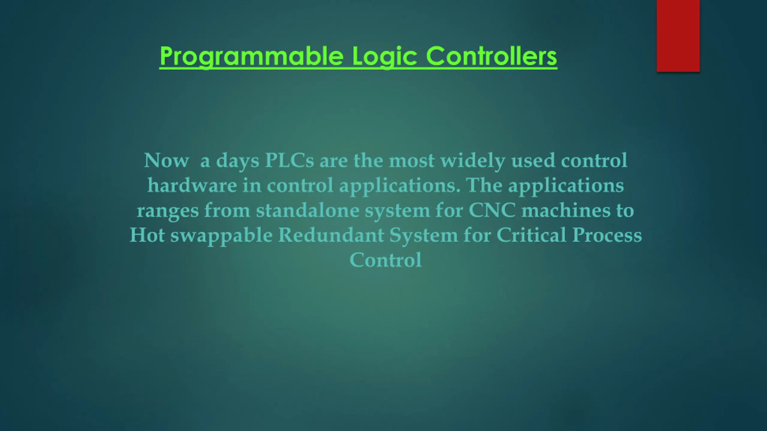 Programmable Logic Controllers Now a days PLCs are the most widely used control hardware in control applications. The applications ranges from standalone system for CNC machines to Hot swappable Redundant System for Critical Process Control