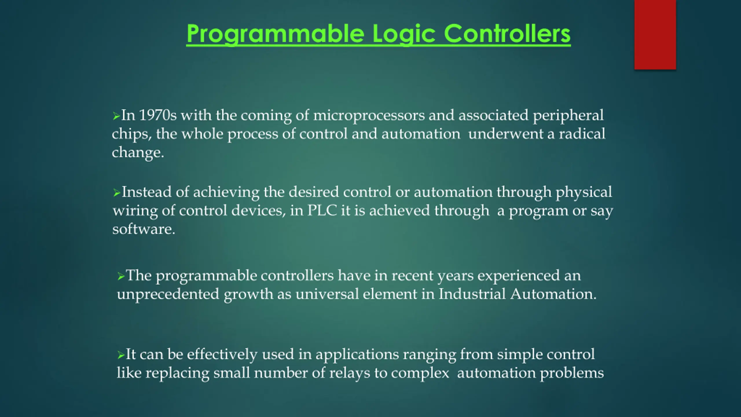 Programmable Logic Controllers In 1970s with the coming of microprocessors and associated peripheral chips, the whole process of control and automation underwent a radical change. Instead of achieving the desired control or automation through physical wiring of control devices, in PLC it is achieved through a program or say software. The programmable controllers have in recent years experienced an unprecedented growth as universal element in Industrial Automation. It can be effectively used in applications ranging from simple control like replacing small number of relays to complex automation problems