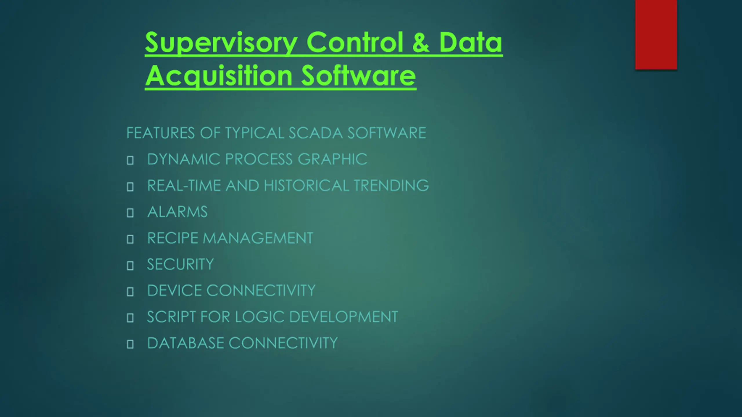 Supervisory Control & Data Acquisition Software FEATURES OF TYPICAL SCADA SOFTWARE DYNAMIC PROCESS GRAPHIC REAL-TIME AND HISTORICAL TRENDING ALARMS RECIPE MANAGEMENT SECURITY DEVICE CONNECTIVITY SCRIPT FOR LOGIC DEVELOPMENT DATABASE CONNECTIVITY