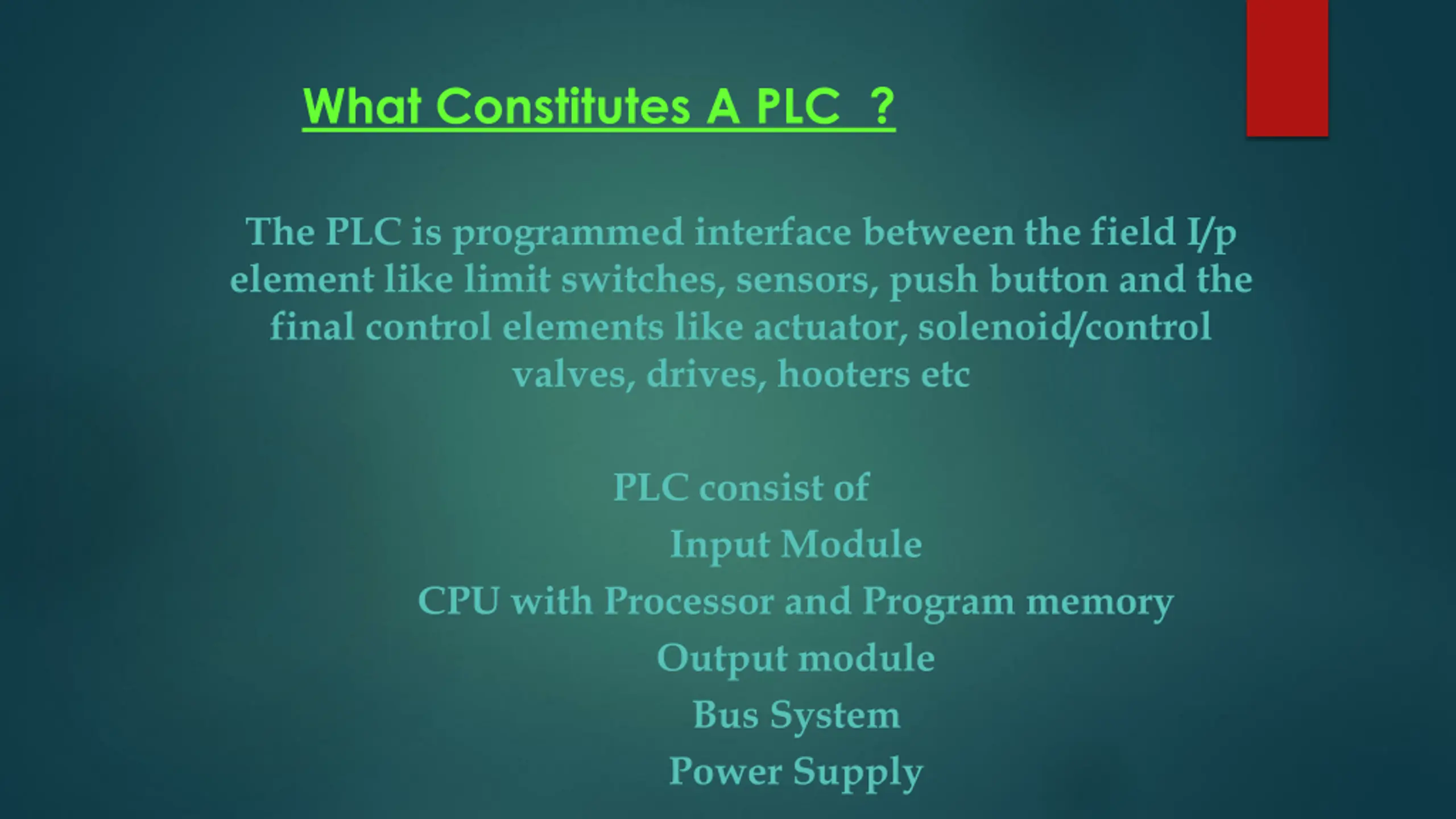 What Constitutes A PLC ? The PLC is programmed interface between the field I/p element like limit switches, sensors, push button and the final control elements like actuator, solenoid/control valves, drives, hooters etc PLC consist of Input Module CPU with Processor and Program memory Output module Bus System Power Supply