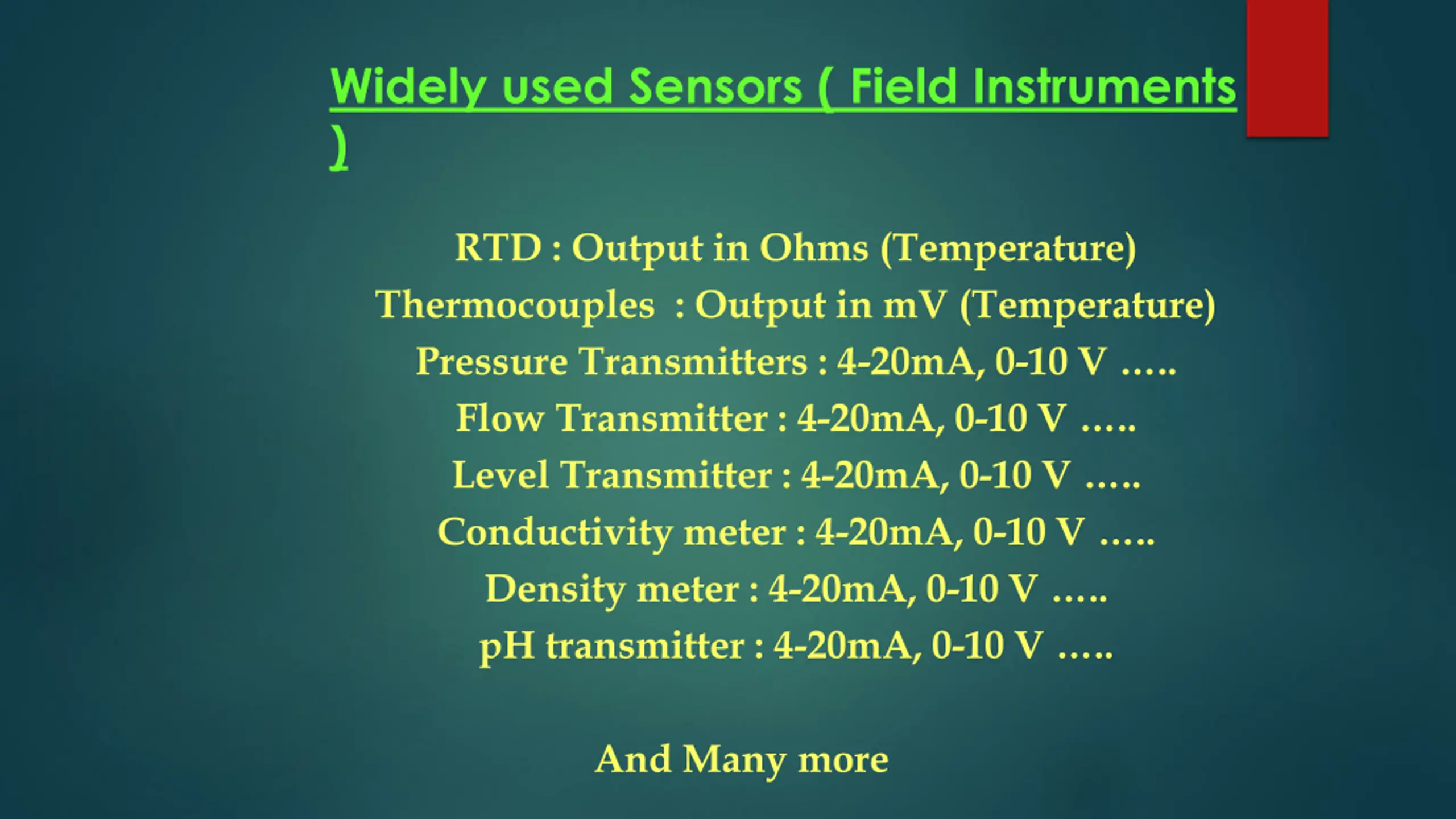 Widely used Sensors ( Field Instruments ) RTD : Output in Ohms (Temperature) Thermocouples : Output in mV (Temperature) Pressure Transmitters : 4-20mA, 0-10 V .. Flow Transmitter : 4-20mA, 0-10 V .. Level Transmitter : 4-20mA, 0-10 V .. Conductivity meter : 4-20mA, 0-10 V .. Density meter : 4-20mA, 0-10 V .. pH transmitter : 4-20mA, 0-10 V .. And Many more