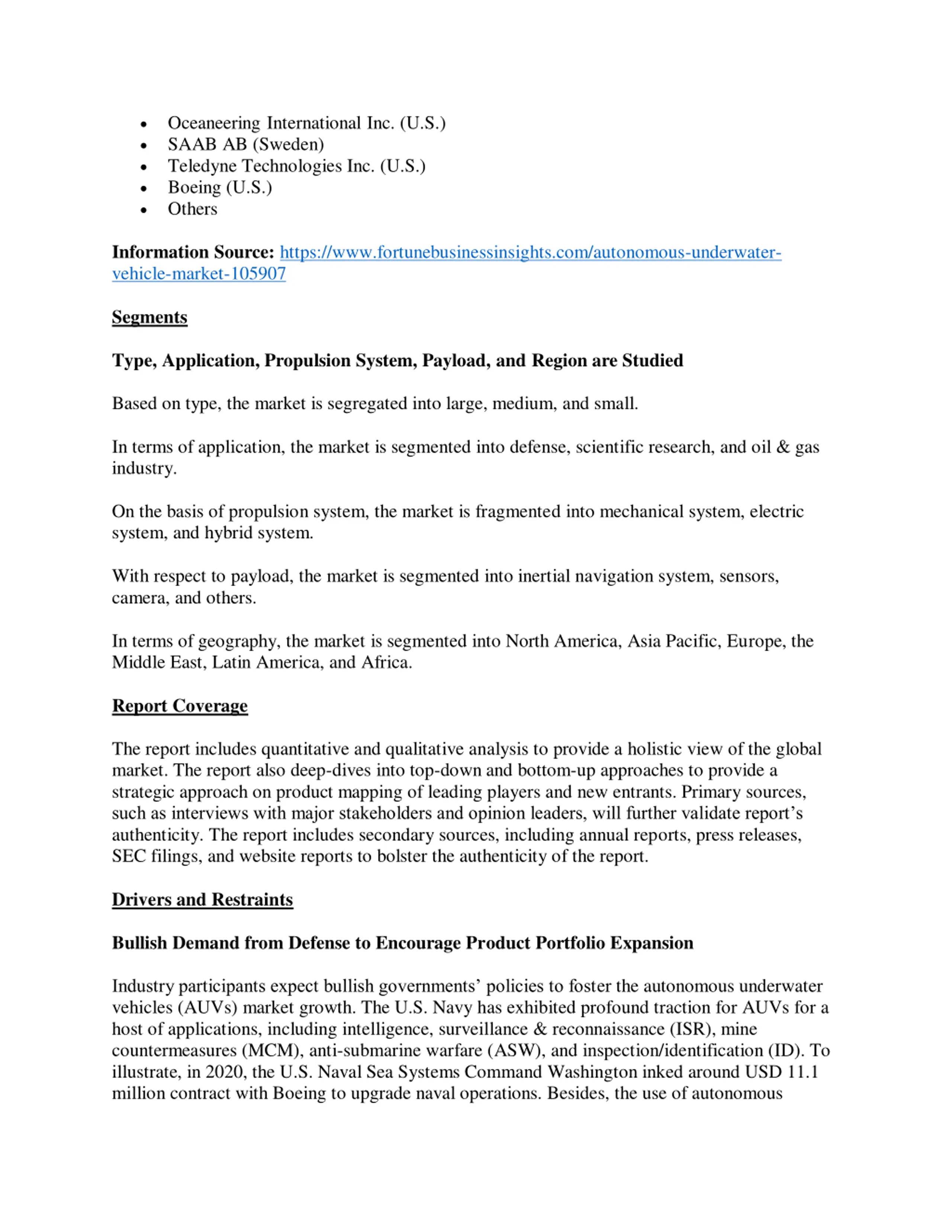 Oceaneering International Inc. (U.S.) SAAB AB (Sweden) Teledyne Technologies Inc. (U.S.) Boeing (U.S.) Others Information Source: https://www.fortunebusinessinsights.com/autonomous-underwater- vehicle-market-105907 Segments Type, Application, Propulsion System, Payload, and Region are Studied Based on type, the market is segregated into large, medium, and small. In terms of application, the market is segmented into defense, scientific research, and oil & gas industry. On the basis of propulsion system, the market is fragmented into mechanical system, electric system, and hybrid system. With respect to payload, the market is segmented into inertial navigation system, sensors, camera, and others. In terms of geography, the market is segmented into North America, Asia Pacific, Europe, the Middle East, Latin America, and Africa. Report Coverage The report includes quantitative and qualitative analysis to provide a holistic view of the global market. The report also deep-dives into top-down and bottom-up approaches to provide a strategic approach on product mapping of leading players and new entrants. Primary sources, such as interviews with major stakeholders and opinion leaders, will further validate report s authenticity. The report includes secondary sources, including annual reports, press releases, SEC filings, and website reports to bolster the authenticity of the report. Drivers and Restraints Bullish Demand from Defense to Encourage Product Portfolio Expansion Industry participants expect bullish governments policies to foster the autonomous underwater vehicles (AUVs) market growth. The U.S. Navy has exhibited profound traction for AUVs for a host of applications, including intelligence, surveillance & reconnaissance (ISR), mine countermeasures (MCM), anti-submarine warfare (ASW), and inspection/identification (ID). To illustrate, in 2020, the U.S. Naval Sea Systems Command Washington inked around USD 11.1 million contract with Boeing to upgrade naval operations. Besides, the use of autonomous