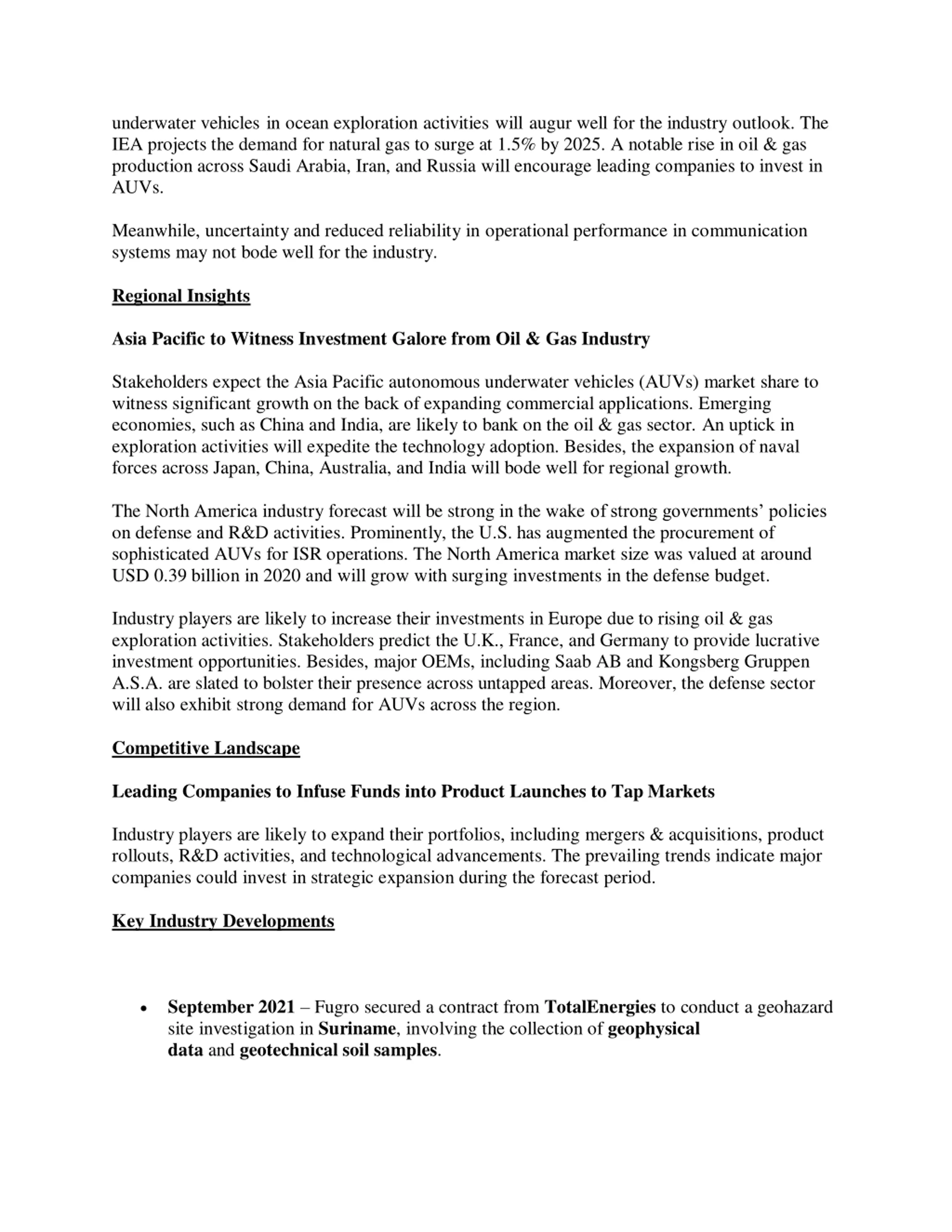 underwater vehicles in ocean exploration activities will augur well for the industry outlook. The IEA projects the demand for natural gas to surge at 1.5% by 2025. A notable rise in oil & gas production across Saudi Arabia, Iran, and Russia will encourage leading companies to invest in AUVs. Meanwhile, uncertainty and reduced reliability in operational performance in communication systems may not bode well for the industry. Regional Insights Asia Pacific to Witness Investment Galore from Oil & Gas Industry Stakeholders expect the Asia Pacific autonomous underwater vehicles (AUVs) market share to witness significant growth on the back of expanding commercial applications. Emerging economies, such as China and India, are likely to bank on the oil & gas sector. An uptick in exploration activities will expedite the technology adoption. Besides, the expansion of naval forces across Japan, China, Australia, and India will bode well for regional growth. The North America industry forecast will be strong in the wake of strong governments policies on defense and R&D activities. Prominently, the U.S. has augmented the procurement of sophisticated AUVs for ISR operations. The North America market size was valued at around USD 0.39 billion in 2020 and will grow with surging investments in the defense budget. Industry players are likely to increase their investments in Europe due to rising oil & gas exploration activities. Stakeholders predict the U.K., France, and Germany to provide lucrative investment opportunities. Besides, major OEMs, including Saab AB and Kongsberg Gruppen A.S.A. are slated to bolster their presence across untapped areas. Moreover, the defense sector will also exhibit strong demand for AUVs across the region. Competitive Landscape Leading Companies to Infuse Funds into Product Launches to Tap Markets Industry players are likely to expand their portfolios, including mergers & acquisitions, product rollouts, R&D activities, and technological advancements. The prevailing trends indicate major companies could invest in strategic expansion during the forecast period. Key Industry Developments September 2021 Fugro secured a contract from TotalEnergies to conduct a geohazard site investigation in Suriname, involving the collection of geophysical data and geotechnical soil samples.