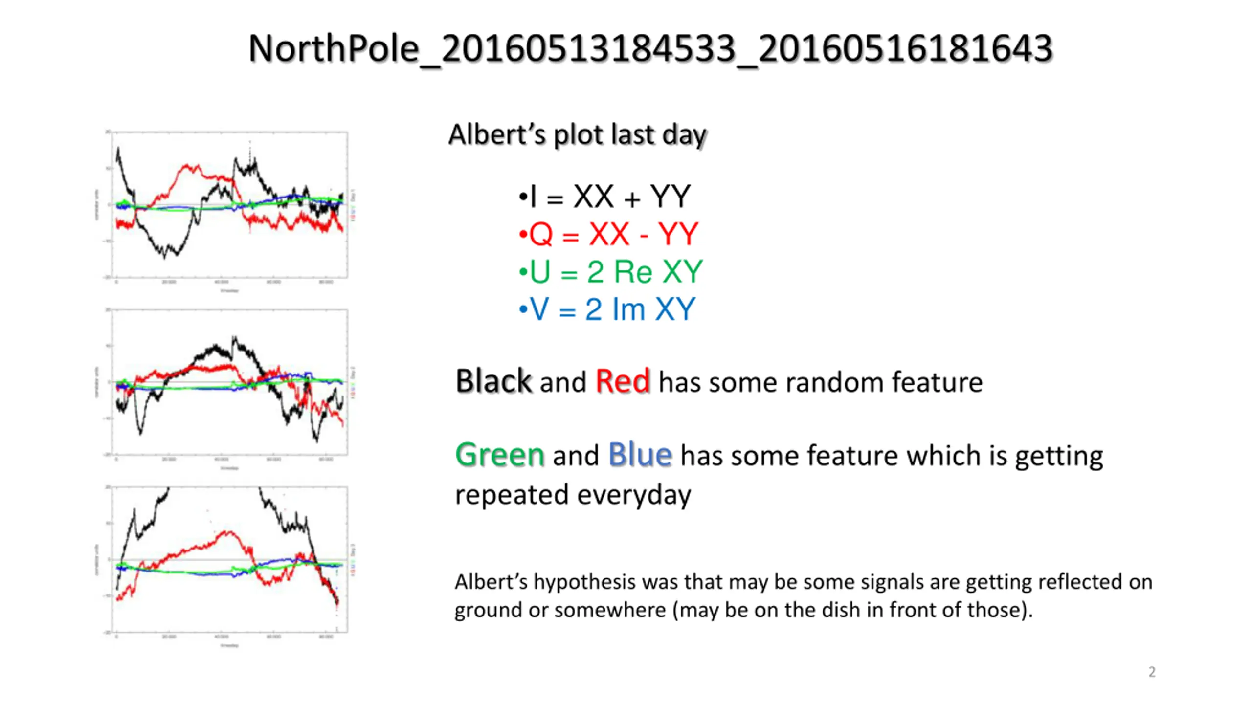 NorthPole_20160513184533_20160516181643 Albert s plot last day I = XX + YY Q = XX - YY U = 2 Re XY V = 2 Im XY Black and Red has some random feature Green and Blue has some feature which is getting repeated everyday Albert s hypothesis was that may be some signals are getting reflected on ground or somewhere (may be on the dish in front of those). 2