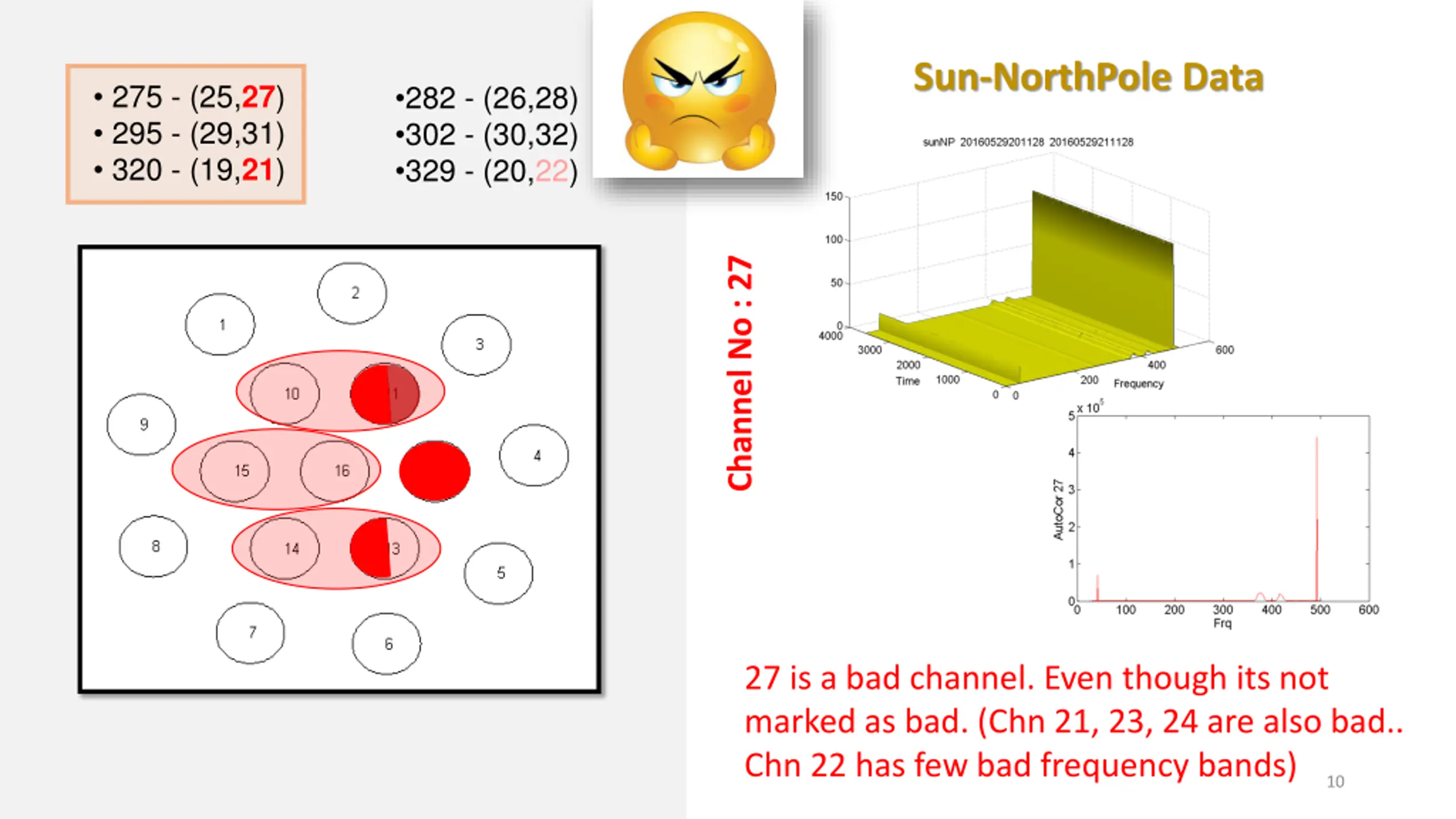 Sun-NorthPole Data 275 - (25,27) 295 - (29,31) 320 - (19,21) 282 - (26,28) 302 - (30,32) 329 - (20,22) Channel No : 27 27 is a bad channel. Even though its not marked as bad. (Chn 21, 23, 24 are also bad.. Chn 22 has few bad frequency bands) 10