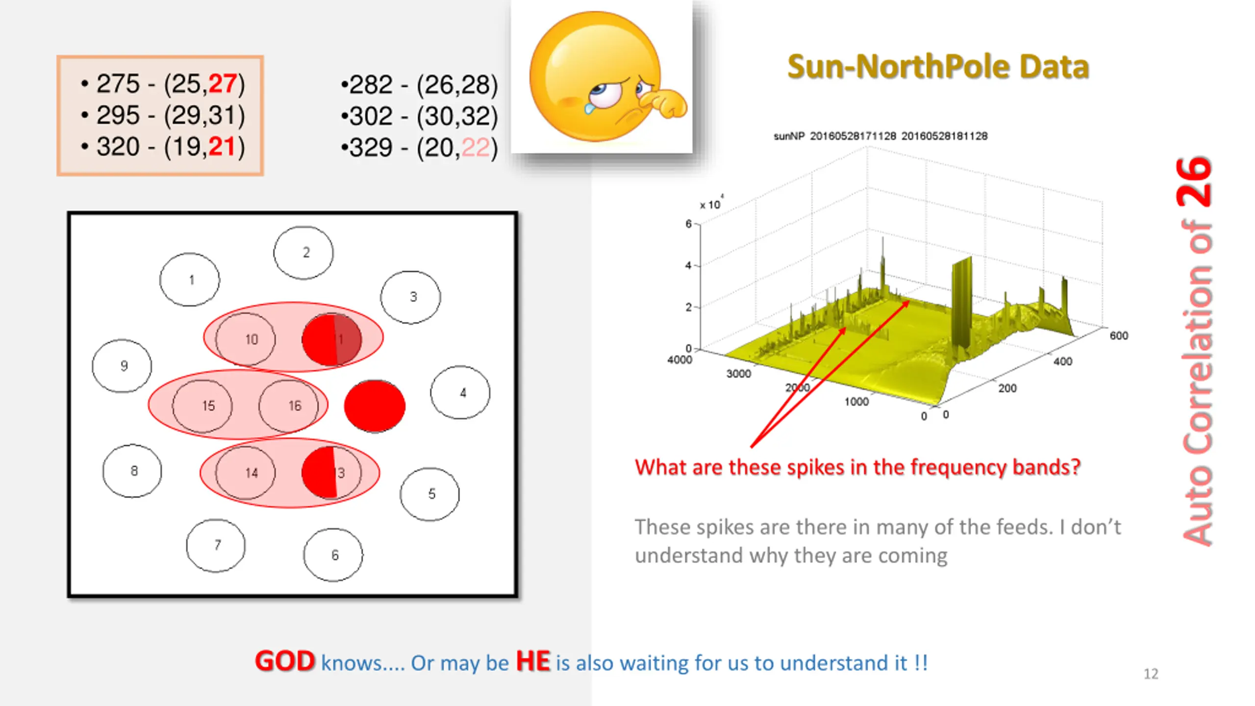 Sun-NorthPole Data 275 - (25,27) 295 - (29,31) 320 - (19,21) 282 - (26,28) 302 - (30,32) 329 - (20,22) Auto Correlation of 26 What are these spikes in the frequency bands? These spikes are there in many of the feeds. I don t understand why they are coming GOD knows.... Or may be HE is also waiting for us to understand it !! 12