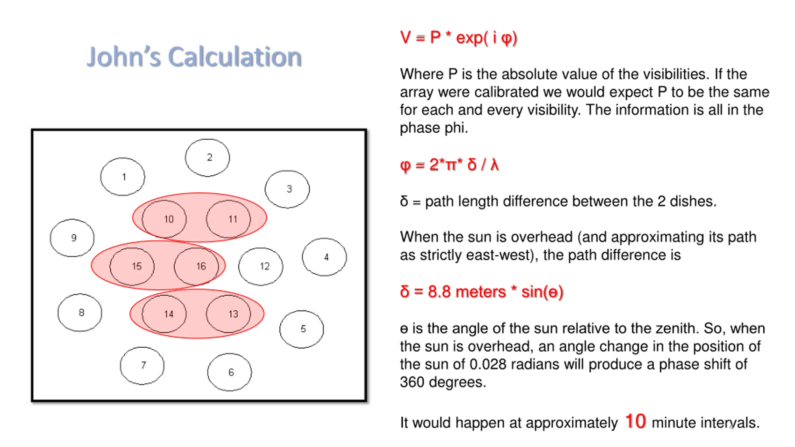 V = P * exp( i ) John s Calculation Where P is the absolute value of the visibilities. If the array were calibrated we would expect P to be the same for each and every visibility. The information is all in the phase phi. = 2* * / = path length difference between the 2 dishes. When the sun is overhead (and approximating its path as strictly east-west), the path difference is = 8.8 meters * sin( ) is the angle of the sun relative to the zenith. So, when the sun is overhead, an angle change in the position of the sun of 0.028 radians will produce a phase shift of 360 degrees. It would happen at approximately 10 minute intervals. 4
