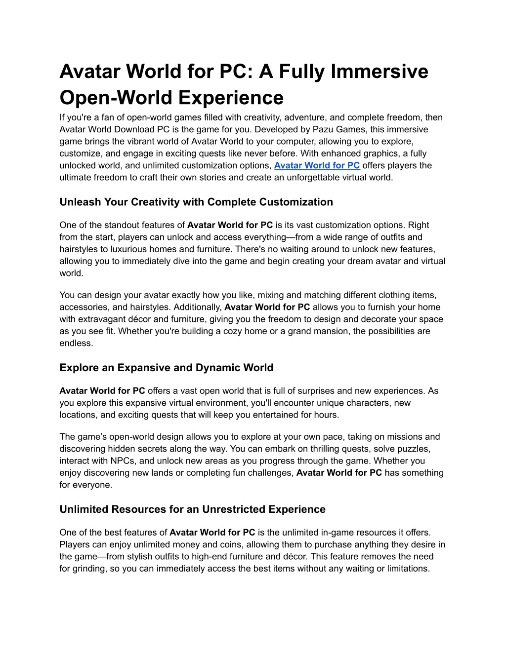 Avatar World for PC: A Fully Immersive Open-World Experience If you're a fan of open-world games filled with creativity, adventure, and complete freedom, then Avatar World Download PC is the game for you. Developed by Pazu Games, this immersive game brings the vibrant world of Avatar World to your computer, allowing you to explore, customize, and engage in exciting quests like never before. With enhanced graphics, a fully unlocked world, and unlimited customization options, Avatar World for PC offers players the ultimate freedom to craft their own stories and create an unforgettable virtual world. Unleash Your Creativity with Complete Customization One of the standout features of Avatar World for PC is its vast customization options. Right from the start, players can unlock and access everything from a wide range of outfits and hairstyles to luxurious homes and furniture. There's no waiting around to unlock new features, allowing you to immediately dive into the game and begin creating your dream avatar and virtual world. You can design your avatar exactly how you like, mixing and matching different clothing items, accessories, and hairstyles. Additionally, Avatar World for PC allows you to furnish your home with extravagant d cor and furniture, giving you the freedom to design and decorate your space as you see fit. Whether you're building a cozy home or a grand mansion, the possibilities are endless. Explore an Expansive and Dynamic World Avatar World for PC offers a vast open world that is full of surprises and new experiences. As you explore this expansive virtual environment, you'll encounter unique characters, new locations, and exciting quests that will keep you entertained for hours. The game s open-world design allows you to explore at your own pace, taking on missions and discovering hidden secrets along the way. You can embark on thrilling quests, solve puzzles, interact with NPCs, and unlock new areas as you progress through the game. Whether you enjoy discovering new lands or completing fun challenges, Avatar World for PC has something for everyone. Unlimited Resources for an Unrestricted Experience One of the best features of Avatar World for PC is the unlimited in-game resources it offers. Players can enjoy unlimited money and coins, allowing them to purchase anything they desire in the game from stylish outfits to high-end furniture and d cor. This feature removes the need for grinding, so you can immediately access the best items without any waiting or limitations.