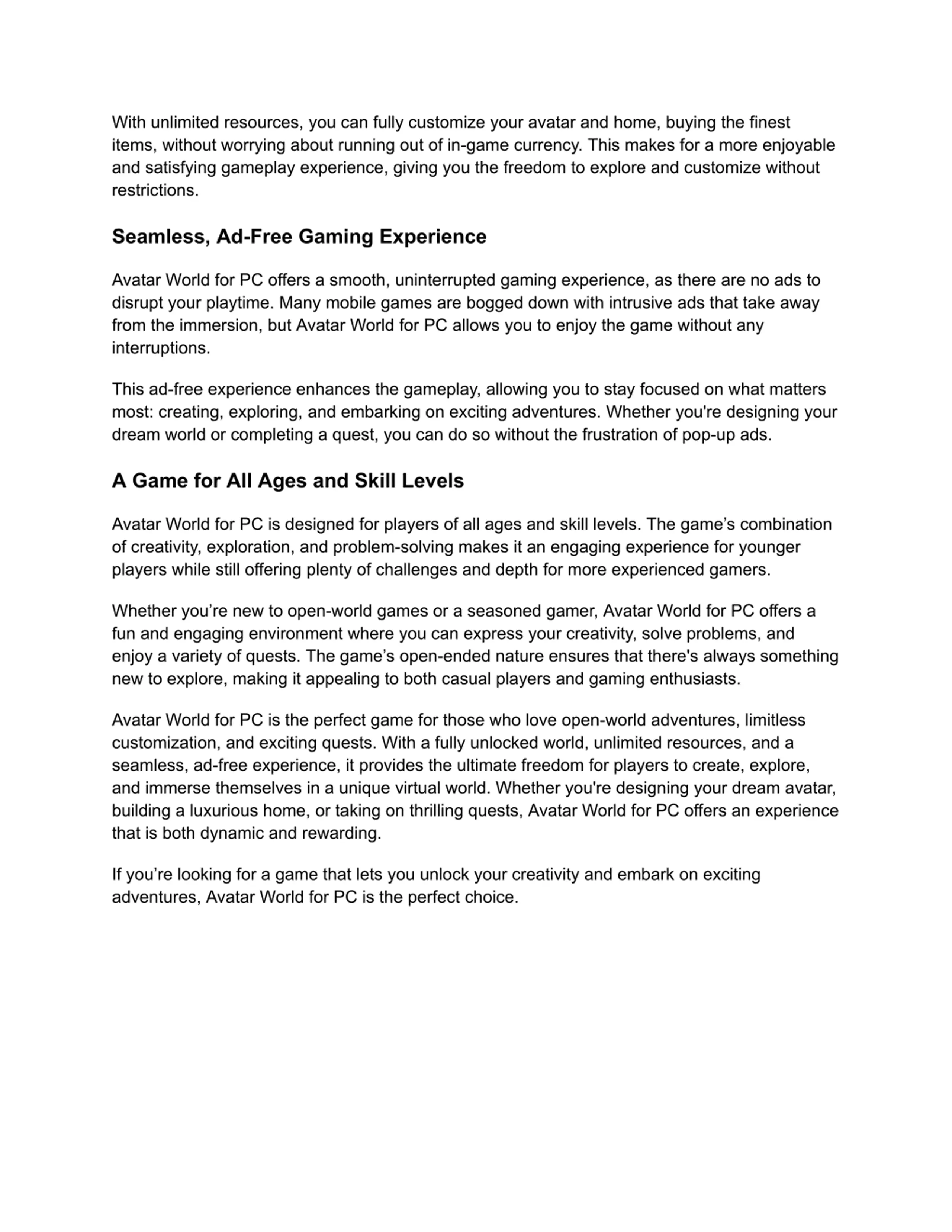 With unlimited resources, you can fully customize your avatar and home, buying the finest items, without worrying about running out of in-game currency. This makes for a more enjoyable and satisfying gameplay experience, giving you the freedom to explore and customize without restrictions. Seamless, Ad-Free Gaming Experience Avatar World for PC offers a smooth, uninterrupted gaming experience, as there are no ads to disrupt your playtime. Many mobile games are bogged down with intrusive ads that take away from the immersion, but Avatar World for PC allows you to enjoy the game without any interruptions. This ad-free experience enhances the gameplay, allowing you to stay focused on what matters most: creating, exploring, and embarking on exciting adventures. Whether you're designing your dream world or completing a quest, you can do so without the frustration of pop-up ads. A Game for All Ages and Skill Levels Avatar World for PC is designed for players of all ages and skill levels. The game s combination of creativity, exploration, and problem-solving makes it an engaging experience for younger players while still offering plenty of challenges and depth for more experienced gamers. Whether you re new to open-world games or a seasoned gamer, Avatar World for PC offers a fun and engaging environment where you can express your creativity, solve problems, and enjoy a variety of quests. The game s open-ended nature ensures that there's always something new to explore, making it appealing to both casual players and gaming enthusiasts. Avatar World for PC is the perfect game for those who love open-world adventures, limitless customization, and exciting quests. With a fully unlocked world, unlimited resources, and a seamless, ad-free experience, it provides the ultimate freedom for players to create, explore, and immerse themselves in a unique virtual world. Whether you're designing your dream avatar, building a luxurious home, or taking on thrilling quests, Avatar World for PC offers an experience that is both dynamic and rewarding. If you re looking for a game that lets you unlock your creativity and embark on exciting adventures, Avatar World for PC is the perfect choice.