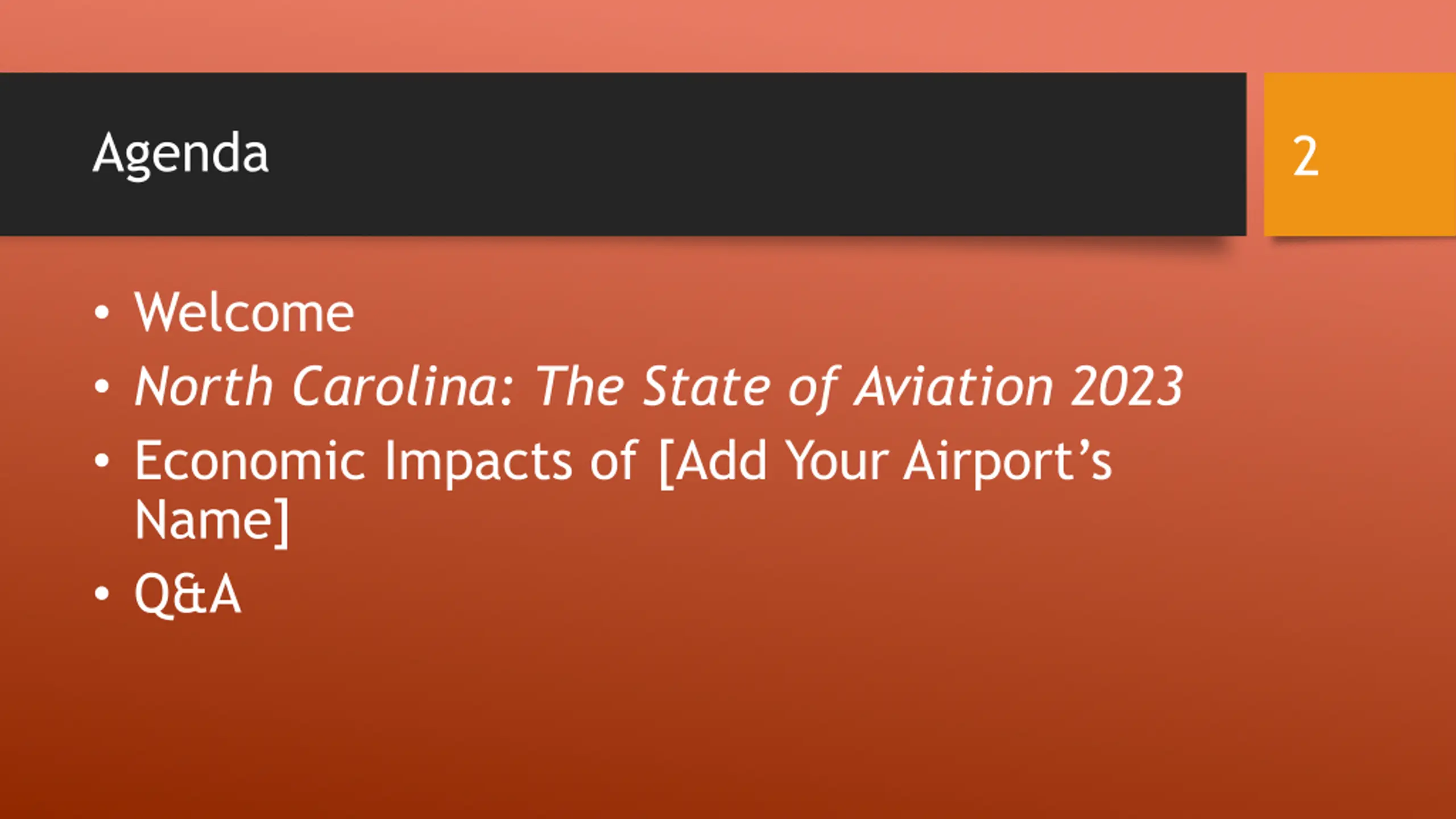 Agenda 2 Welcome North Carolina: The State of Aviation 2023 Economic Impacts of [Add Your Airport s Name] Q&A