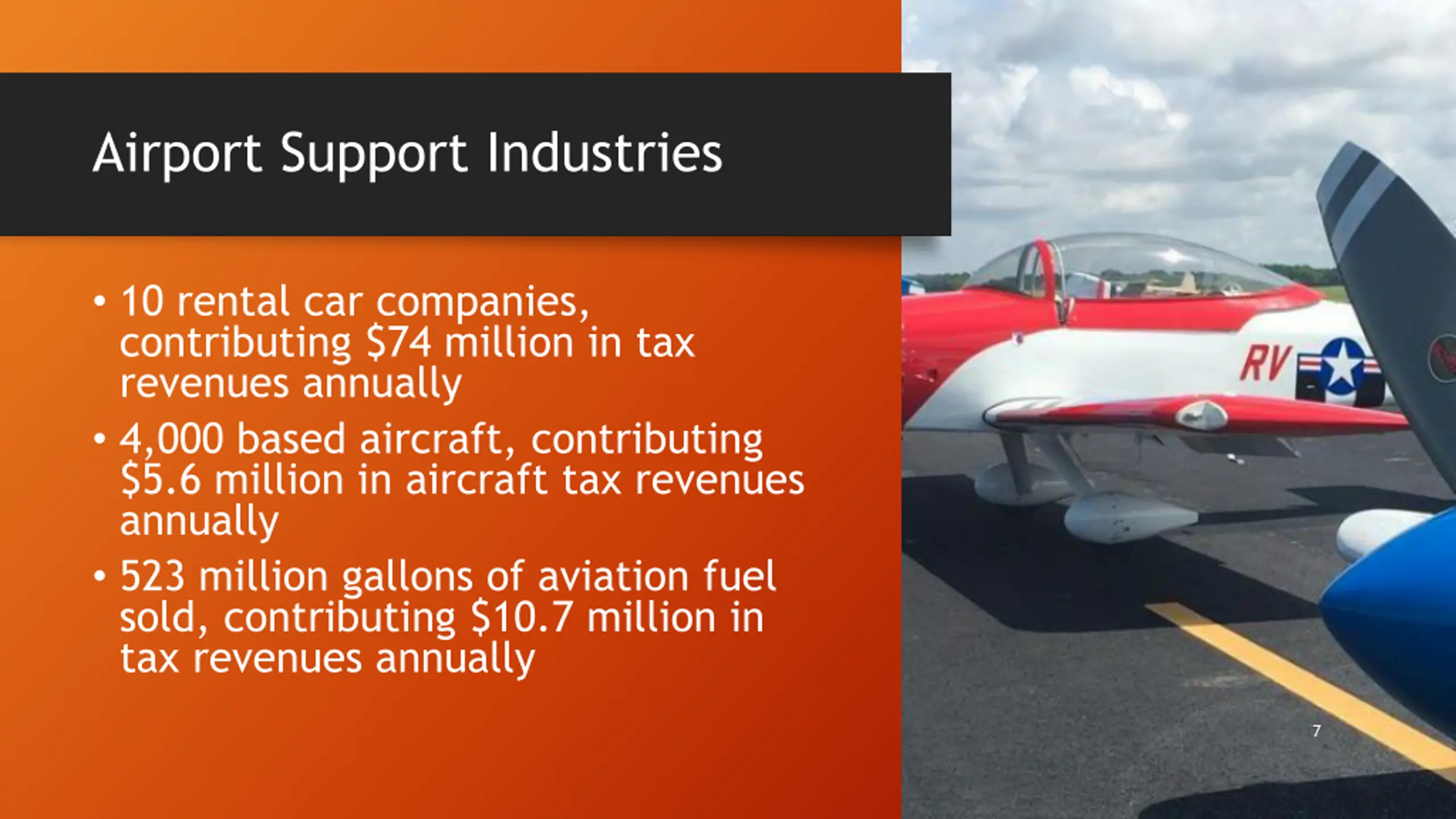 Airport Support Industries 10 rental car companies, contributing $74 million in tax revenues annually 4,000 based aircraft, contributing $5.6 million in aircraft tax revenues annually 523 million gallons of aviation fuel sold, contributing $10.7 million in tax revenues annually 7