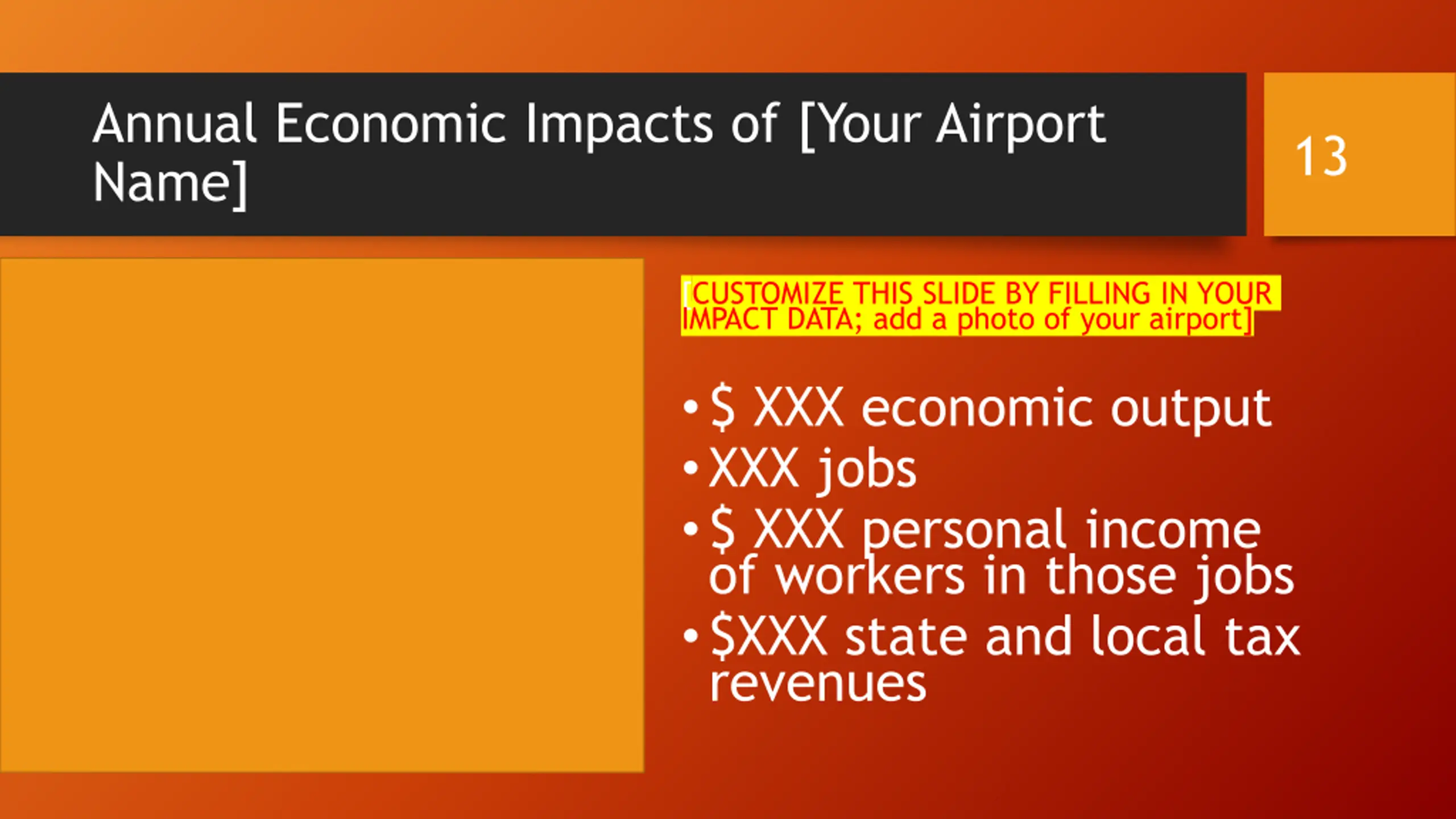 Annual Economic Impacts of [Your Airport Name] 13 [CUSTOMIZE THIS SLIDE BY FILLING IN YOUR IMPACT DATA; add a photo of your airport] $ XXX economic output XXX jobs $ XXX personal income of workers in those jobs $XXX state and local tax revenues