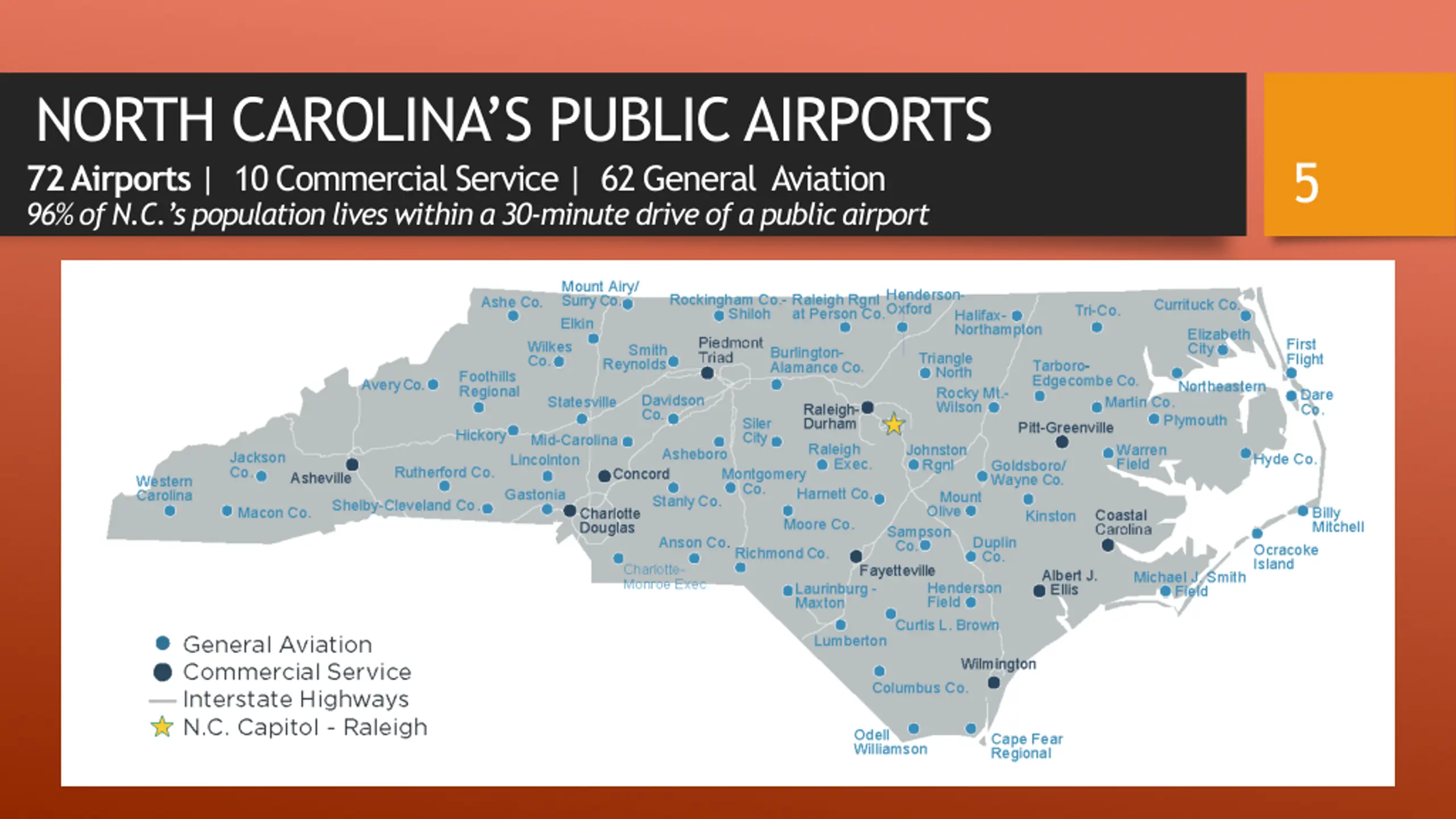 NORTH CAROLINAS PUBLIC AIRPORTS 72 Airports | 10 Commercial Service | 62 General Aviation 96% of N.C. s population lives within a 30-minute drive of a public airport 5
