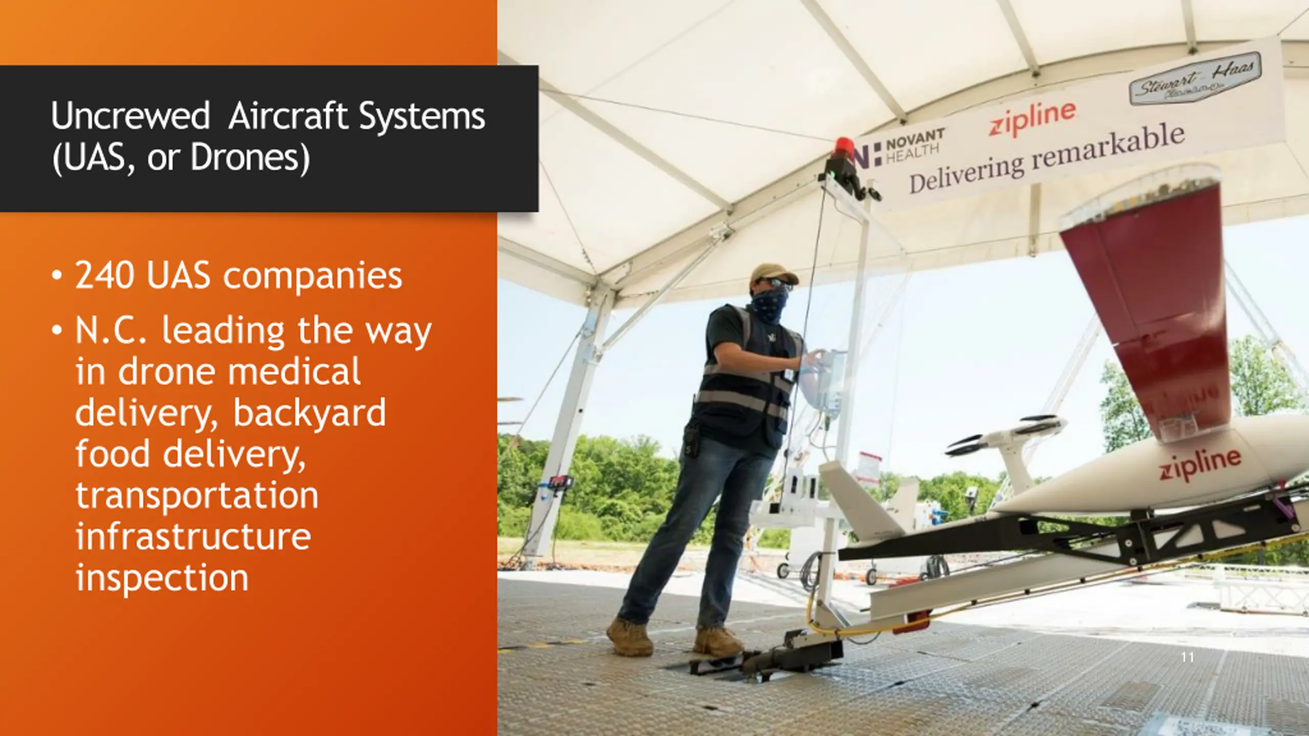 Uncrewed Aircraft Systems (UAS, or Drones) 240 UAS companies N.C. leading the way in drone medical delivery, backyard food delivery, transportation infrastructure inspection 11