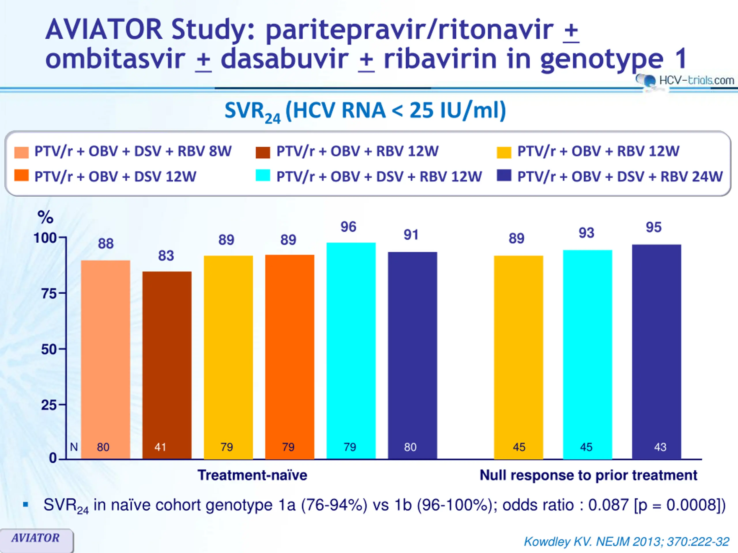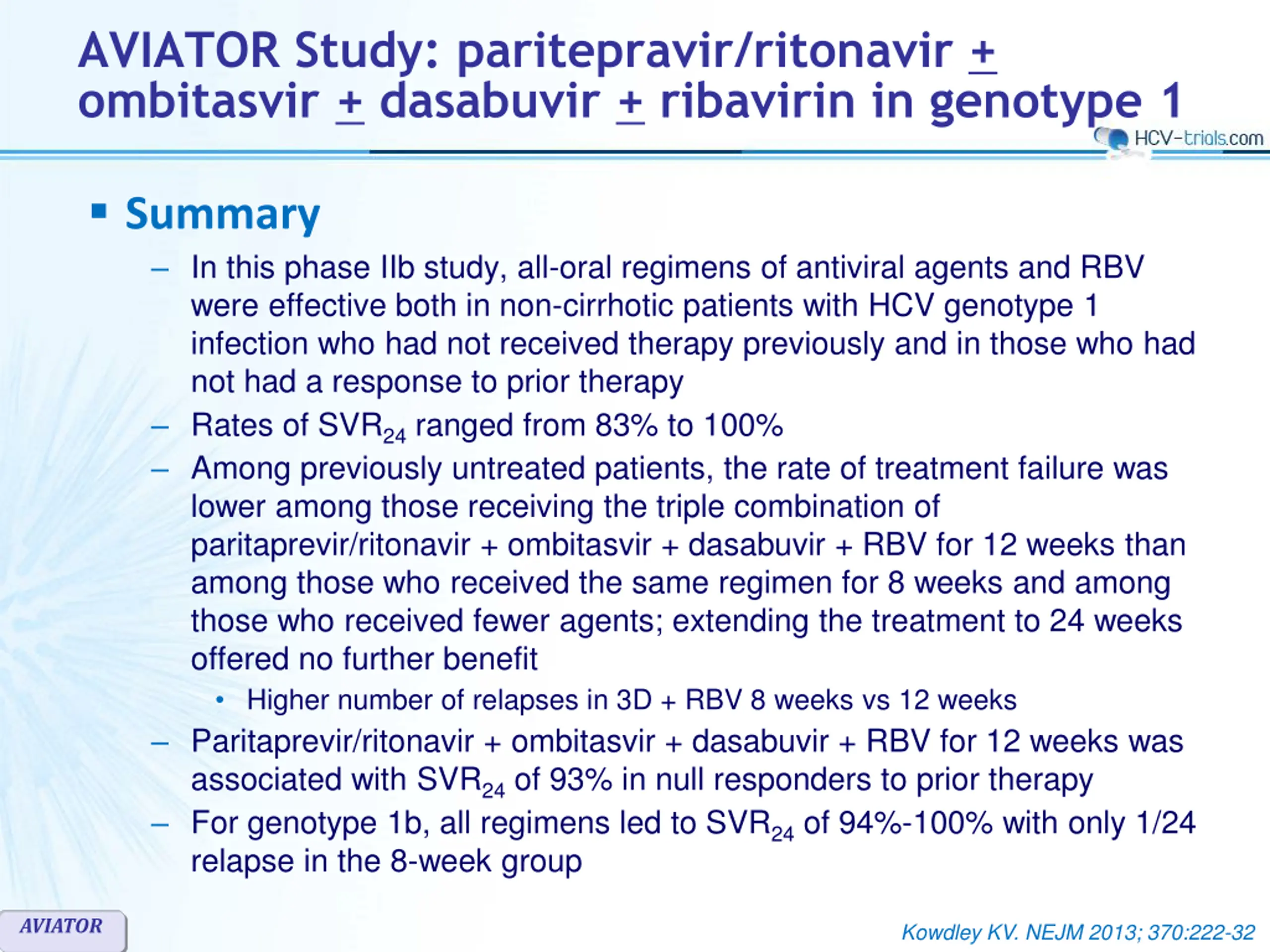 AVIATOR Study: paritepravir/ritonavir + ombitasvir + dasabuvir + ribavirin in genotype 1 Summary In this phase IIb study, all-oral regimens of antiviral agents and RBV were effective both in non-cirrhotic patients with HCV genotype 1 infection who had not received therapy previously and in those who had not had a response to prior therapy Rates of SVR24ranged from 83% to 100% Among previously untreated patients, the rate of treatment failure was lower among those receiving the triple combination of paritaprevir/ritonavir + ombitasvir + dasabuvir + RBV for 12 weeks than among those who received the same regimen for 8 weeks and among those who received fewer agents; extending the treatment to 24 weeks offered no further benefit Higher number of relapses in 3D + RBV 8 weeks vs 12 weeks Paritaprevir/ritonavir + ombitasvir + dasabuvir + RBV for 12 weeks was associated with SVR24of 93% in null responders to prior therapy For genotype 1b, all regimens led to SVR24of 94%-100% with only 1/24 relapse in the 8-week group AVIATOR Kowdley KV. NEJM 2013; 370:222-32