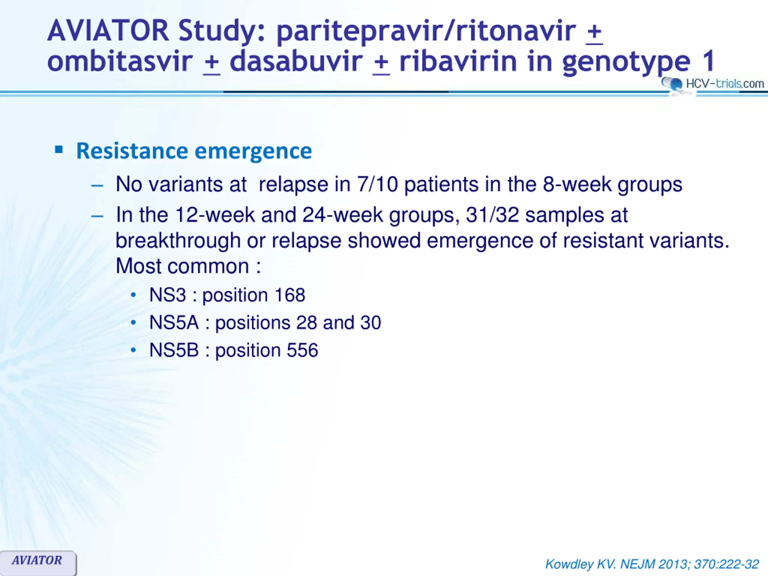 AVIATOR Study: paritepravir/ritonavir + ombitasvir + dasabuvir + ribavirin in genotype 1 Resistance emergence No variants at relapse in 7/10 patients in the 8-week groups In the 12-week and 24-week groups, 31/32 samples at breakthrough or relapse showed emergence of resistant variants. Most common : NS3 : position 168 NS5A : positions 28 and 30 NS5B : position 556 AVIATOR Kowdley KV. NEJM 2013; 370:222-32