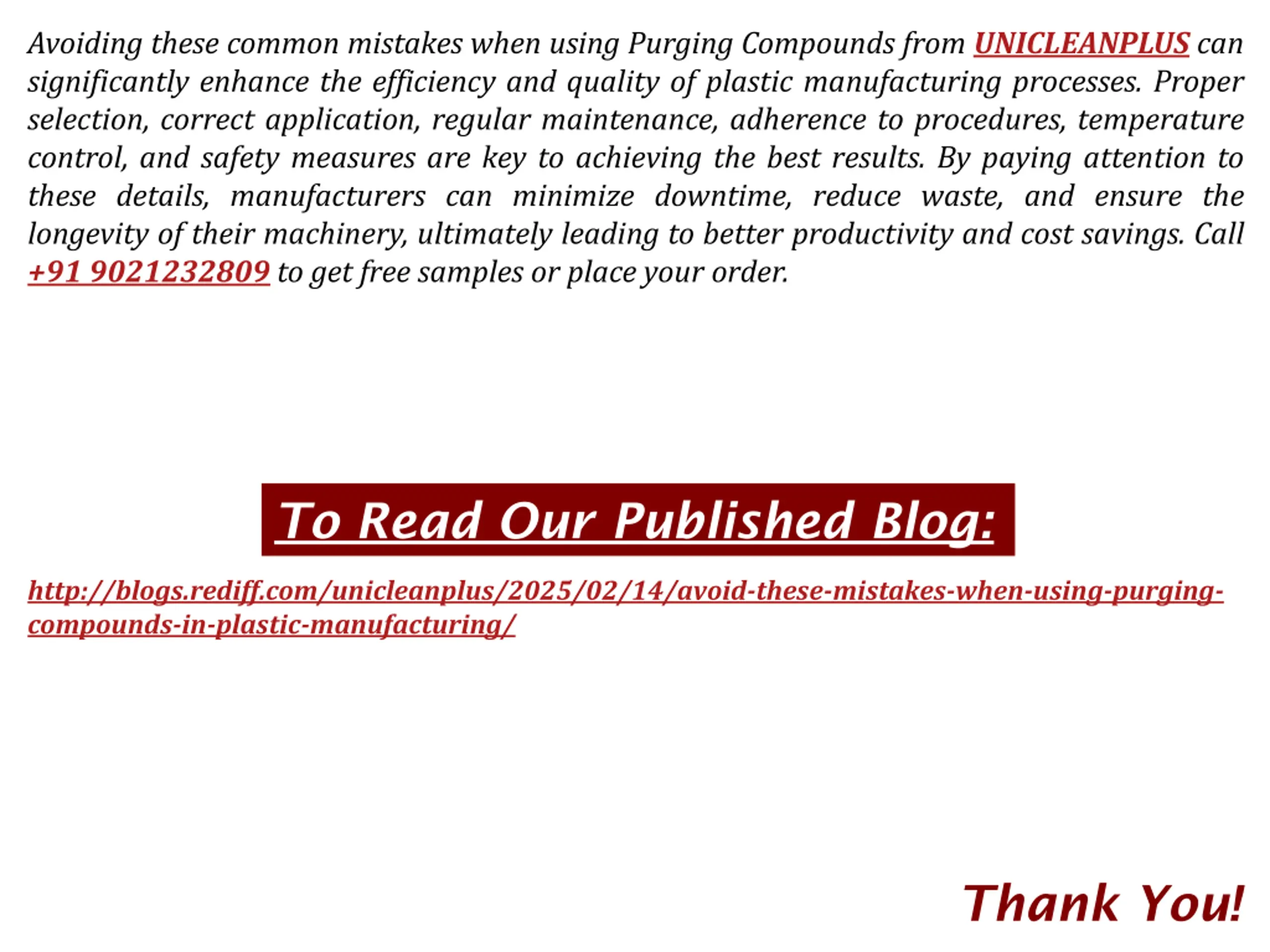 Avoiding these common mistakes when using Purging Compounds from UNICLEANPLUS can significantly enhance the efficiency and quality of plastic manufacturing processes. Proper selection, correct application, regular maintenance, adherence to procedures, temperature control, and safety measures are key to achieving the best results. By paying attention to these details, manufacturers can minimize downtime, reduce waste, and ensure the longevity of their machinery, ultimately leading to better productivity and cost savings. Call +91 9021232809 to get free samples or place your order. To Read Our Published Blog: http://blogs.rediff.com/unicleanplus/2025/02/14/avoid-these-mistakes-when-using-purging- compounds-in-plastic-manufacturing/ Thank You!