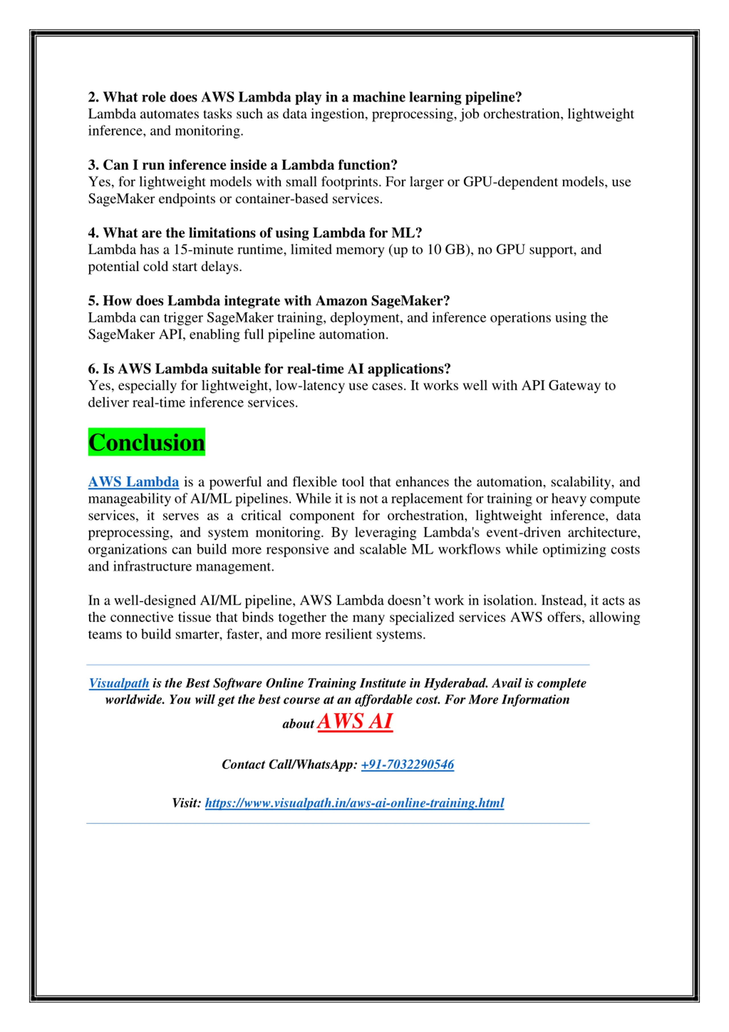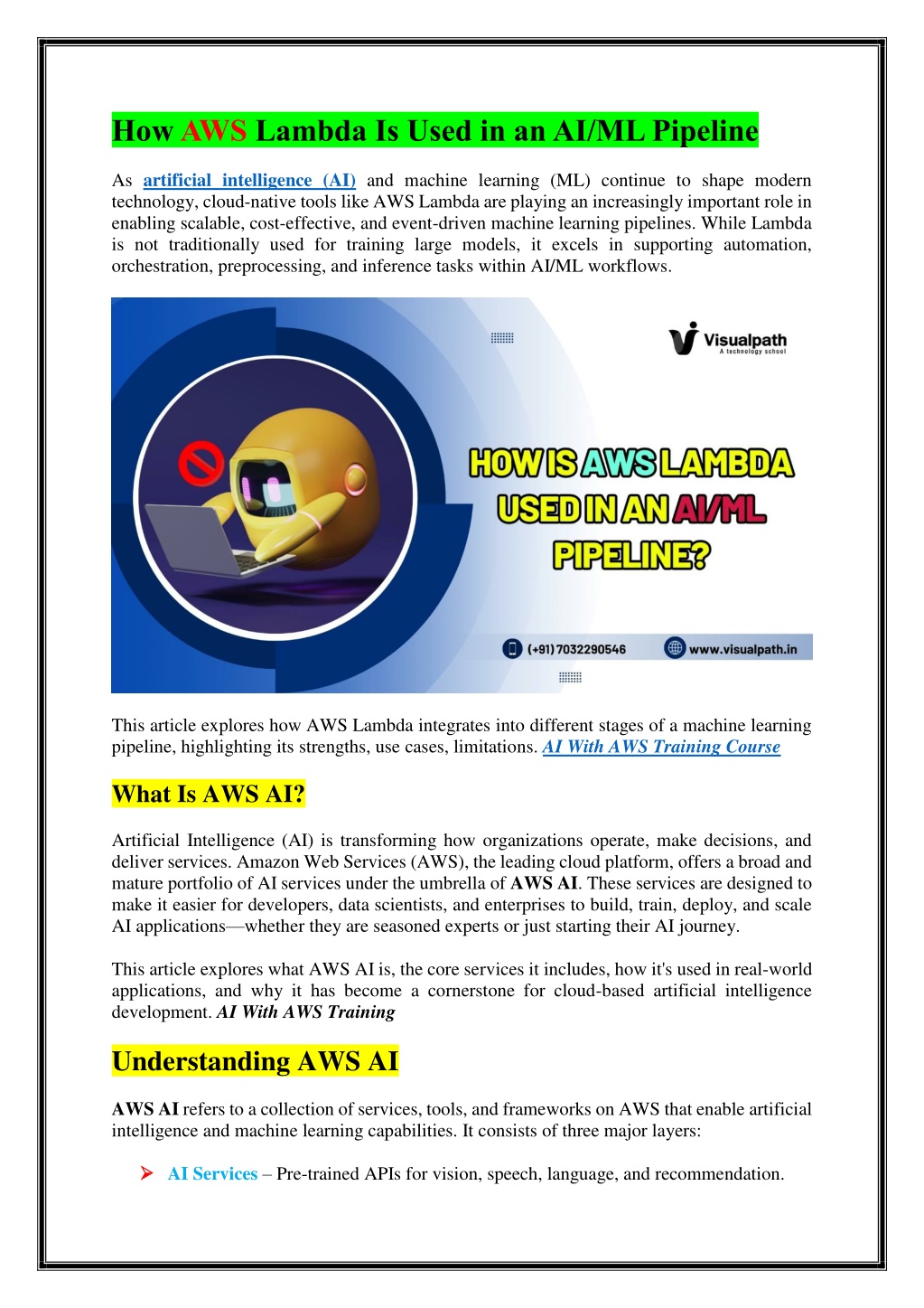 2. What role does AWS Lambda play in a machine learning pipeline? Lambda automates tasks such as data ingestion, preprocessing, job orchestration, lightweight inference, and monitoring. 3. Can I run inference inside a Lambda function? Yes, for lightweight models with small footprints. For larger or GPU-dependent models, use SageMaker endpoints or container-based services. 4. What are the limitations of using Lambda for ML? Lambda has a 15-minute runtime, limited memory (up to 10 GB), no GPU support, and potential cold start delays. 5. How does Lambda integrate with Amazon SageMaker? Lambda can trigger SageMaker training, deployment, and inference operations using the SageMaker API, enabling full pipeline automation. 6. Is AWS Lambda suitable for real-time AI applications? Yes, especially for lightweight, low-latency use cases. It works well with API Gateway to deliver real-time inference services. Conclusion AWS Lambda is a powerful and flexible tool that enhances the automation, scalability, and manageability of AI/ML pipelines. While it is not a replacement for training or heavy compute services, it serves as a critical component for orchestration, lightweight inference, data preprocessing, and system monitoring. By leveraging Lambda's event-driven architecture, organizations can build more responsive and scalable ML workflows while optimizing costs and infrastructure management. In a well-designed AI/ML pipeline, AWS Lambda doesn t work in isolation. Instead, it acts as the connective tissue that binds together the many specialized services AWS offers, allowing teams to build smarter, faster, and more resilient systems. Visualpath is the Best Software Online Training Institute in Hyderabad. Avail is complete worldwide. You will get the best course at an affordable cost. For More Information about AWS AI Contact Call/WhatsApp: +91-7032290546 Visit: https://www.visualpath.in/aws-ai-online-training.html