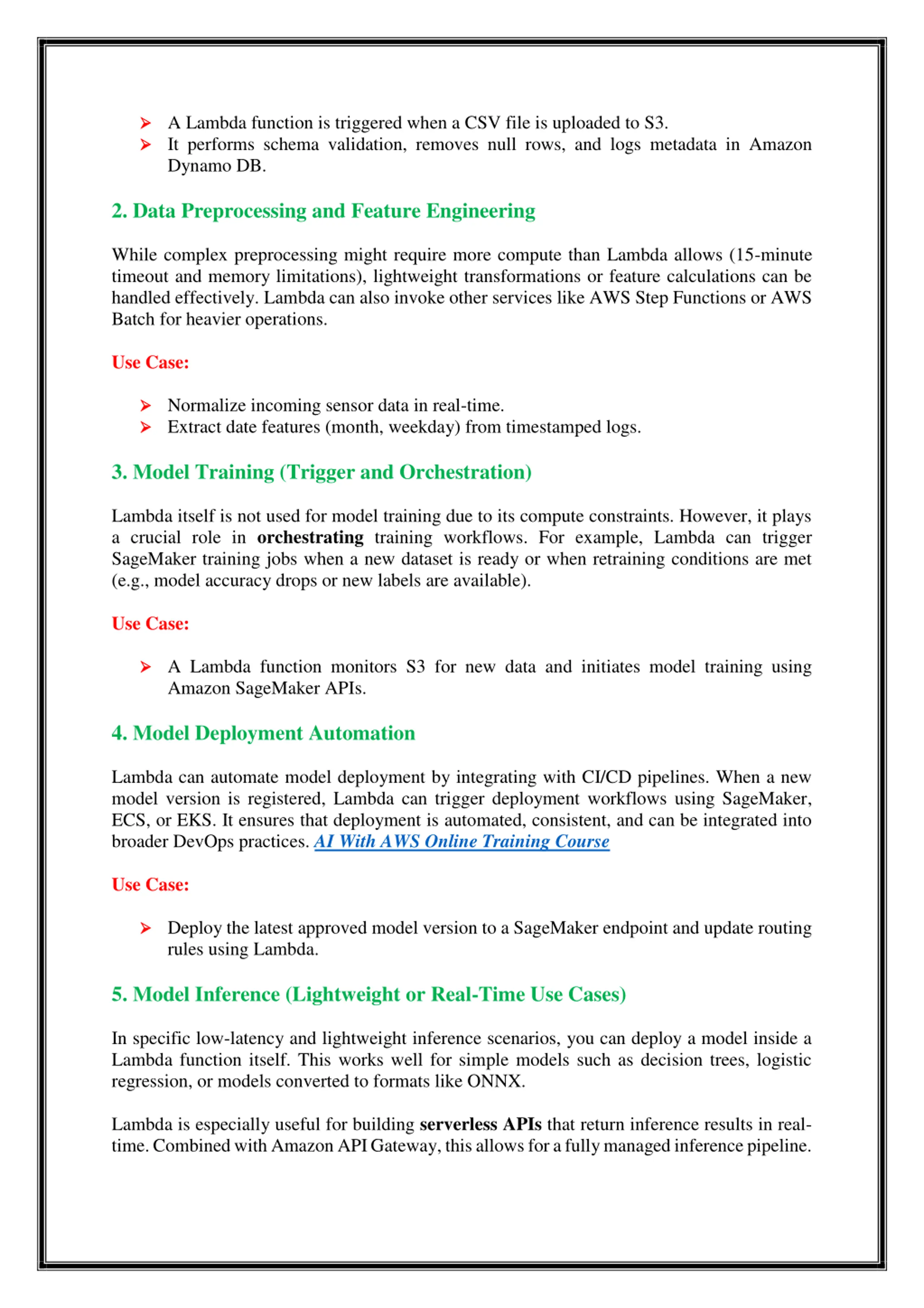 A Lambda function is triggered when a CSV file is uploaded to S3. It performs schema validation, removes null rows, and logs metadata in Amazon Dynamo DB. 2. Data Preprocessing and Feature Engineering While complex preprocessing might require more compute than Lambda allows (15-minute timeout and memory limitations), lightweight transformations or feature calculations can be handled effectively. Lambda can also invoke other services like AWS Step Functions or AWS Batch for heavier operations. Use Case: Normalize incoming sensor data in real-time. Extract date features (month, weekday) from timestamped logs. 3. Model Training (Trigger and Orchestration) Lambda itself is not used for model training due to its compute constraints. However, it plays a crucial role in orchestrating training workflows. For example, Lambda can trigger SageMaker training jobs when a new dataset is ready or when retraining conditions are met (e.g., model accuracy drops or new labels are available). Use Case: A Lambda function monitors S3 for new data and initiates model training using Amazon SageMaker APIs. 4. Model Deployment Automation Lambda can automate model deployment by integrating with CI/CD pipelines. When a new model version is registered, Lambda can trigger deployment workflows using SageMaker, ECS, or EKS. It ensures that deployment is automated, consistent, and can be integrated into broader DevOps practices. AI With AWS Online Training Course Use Case: Deploy the latest approved model version to a SageMaker endpoint and update routing rules using Lambda. 5. Model Inference (Lightweight or Real-Time Use Cases) In specific low-latency and lightweight inference scenarios, you can deploy a model inside a Lambda function itself. This works well for simple models such as decision trees, logistic regression, or models converted to formats like ONNX. Lambda is especially useful for building serverless APIs that return inference results in real- time. Combined with Amazon API Gateway, this allows for a fully managed inference pipeline.