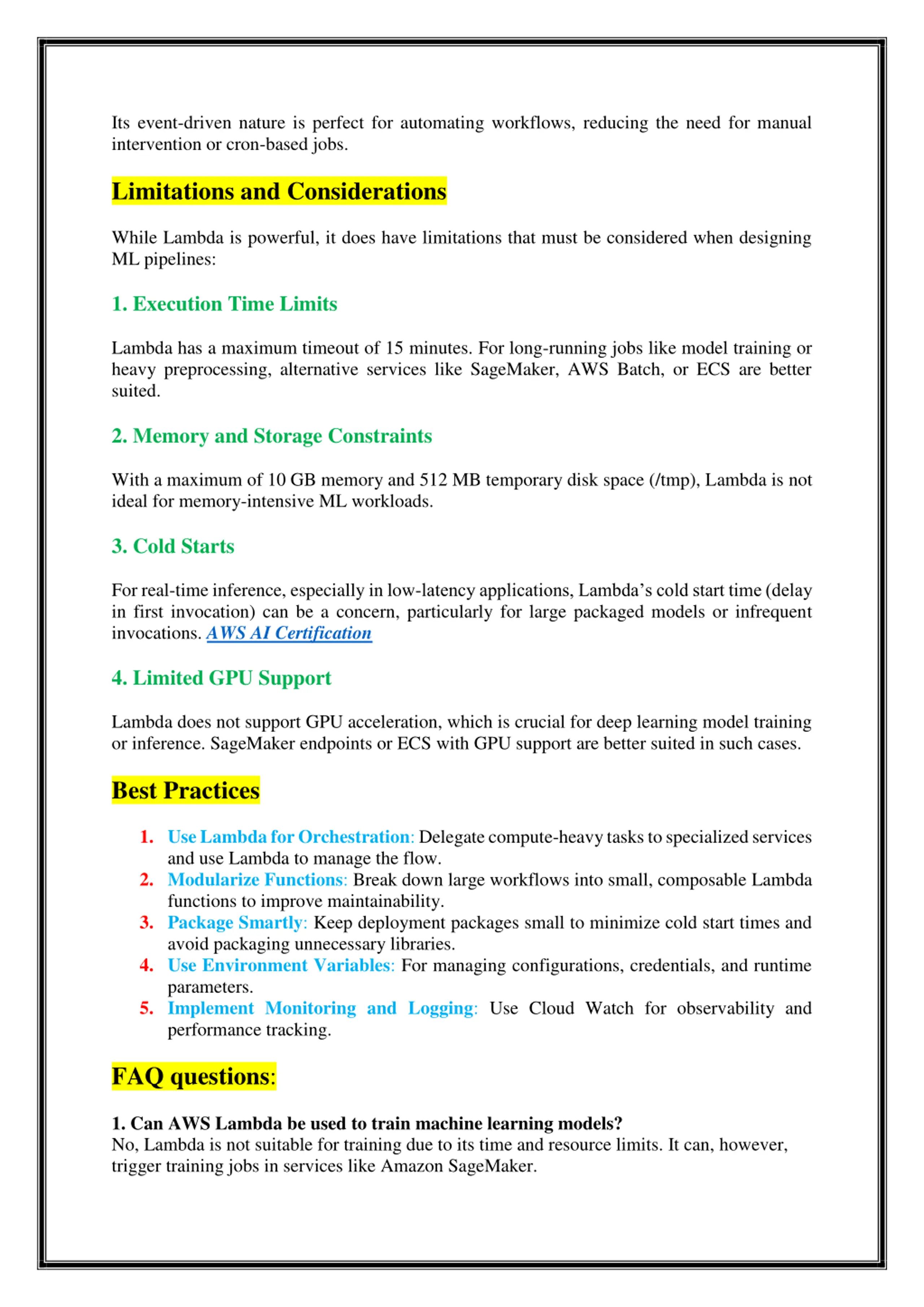 Its event-driven nature is perfect for automating workflows, reducing the need for manual intervention or cron-based jobs. Limitations and Considerations While Lambda is powerful, it does have limitations that must be considered when designing ML pipelines: 1. Execution Time Limits Lambda has a maximum timeout of 15 minutes. For long-running jobs like model training or heavy preprocessing, alternative services like SageMaker, AWS Batch, or ECS are better suited. 2. Memory and Storage Constraints With a maximum of 10 GB memory and 512 MB temporary disk space (/tmp), Lambda is not ideal for memory-intensive ML workloads. 3. Cold Starts For real-time inference, especially in low-latency applications, Lambda s cold start time (delay in first invocation) can be a concern, particularly for large packaged models or infrequent invocations. AWS AI Certification 4. Limited GPU Support Lambda does not support GPU acceleration, which is crucial for deep learning model training or inference. SageMaker endpoints or ECS with GPU support are better suited in such cases. Best Practices 1.Use Lambda for Orchestration: Delegate compute-heavy tasks to specialized services and use Lambda to manage the flow. 2.Modularize Functions: Break down large workflows into small, composable Lambda functions to improve maintainability. 3.Package Smartly: Keep deployment packages small to minimize cold start times and avoid packaging unnecessary libraries. 4.Use Environment Variables: For managing configurations, credentials, and runtime parameters. 5.Implement Monitoring and Logging: Use Cloud Watch for observability and performance tracking. FAQ questions: 1. Can AWS Lambda be used to train machine learning models? No, Lambda is not suitable for training due to its time and resource limits. It can, however, trigger training jobs in services like Amazon SageMaker.