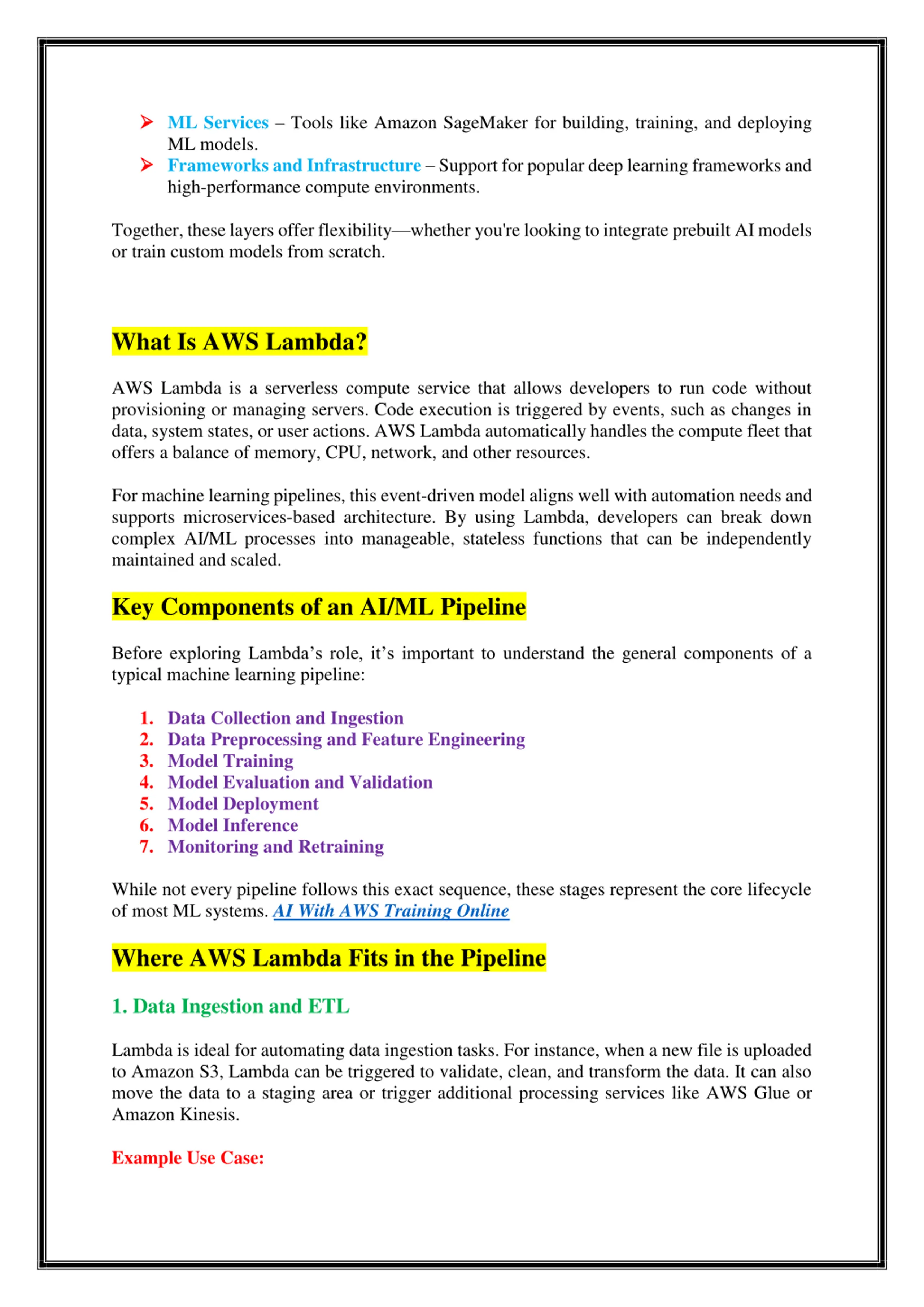 ML Services Tools like Amazon SageMaker for building, training, and deploying ML models. Frameworks and Infrastructure Support for popular deep learning frameworks and high-performance compute environments. Together, these layers offer flexibility whether you're looking to integrate prebuilt AI models or train custom models from scratch. What Is AWS Lambda? AWS Lambda is a serverless compute service that allows developers to run code without provisioning or managing servers. Code execution is triggered by events, such as changes in data, system states, or user actions. AWS Lambda automatically handles the compute fleet that offers a balance of memory, CPU, network, and other resources. For machine learning pipelines, this event-driven model aligns well with automation needs and supports microservices-based architecture. By using Lambda, developers can break down complex AI/ML processes into manageable, stateless functions that can be independently maintained and scaled. Key Components of an AI/ML Pipeline Before exploring Lambda s role, it s important to understand the general components of a typical machine learning pipeline: 1.Data Collection and Ingestion 2.Data Preprocessing and Feature Engineering 3.Model Training 4.Model Evaluation and Validation 5.Model Deployment 6.Model Inference 7.Monitoring and Retraining While not every pipeline follows this exact sequence, these stages represent the core lifecycle of most ML systems. AI With AWS Training Online Where AWS Lambda Fits in the Pipeline 1. Data Ingestion and ETL Lambda is ideal for automating data ingestion tasks. For instance, when a new file is uploaded to Amazon S3, Lambda can be triggered to validate, clean, and transform the data. It can also move the data to a staging area or trigger additional processing services like AWS Glue or Amazon Kinesis. Example Use Case:
