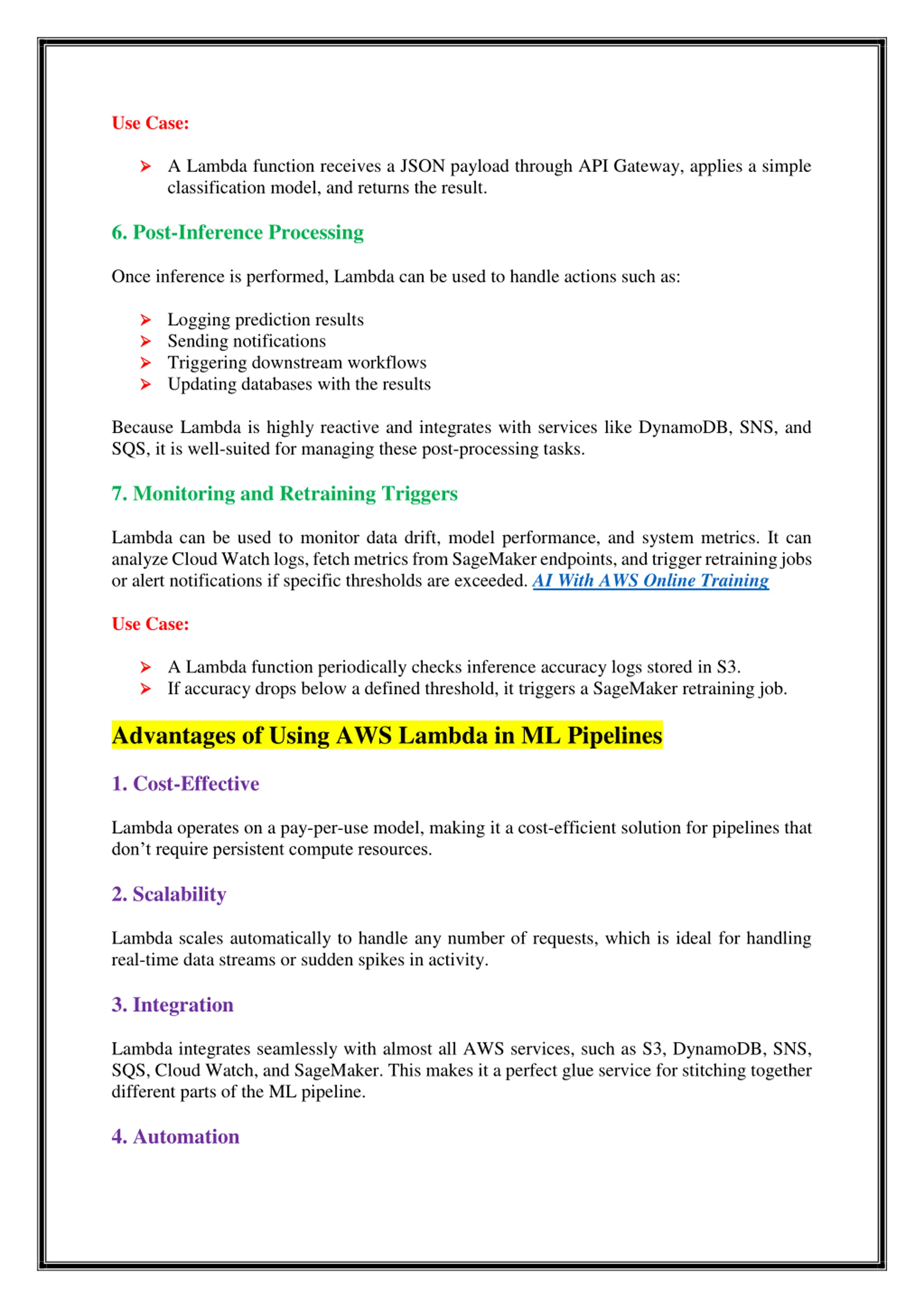 Use Case: A Lambda function receives a JSON payload through API Gateway, applies a simple classification model, and returns the result. 6. Post-Inference Processing Once inference is performed, Lambda can be used to handle actions such as: Logging prediction results Sending notifications Triggering downstream workflows Updating databases with the results Because Lambda is highly reactive and integrates with services like DynamoDB, SNS, and SQS, it is well-suited for managing these post-processing tasks. 7. Monitoring and Retraining Triggers Lambda can be used to monitor data drift, model performance, and system metrics. It can analyze Cloud Watch logs, fetch metrics from SageMaker endpoints, and trigger retraining jobs or alert notifications if specific thresholds are exceeded. AI With AWS Online Training Use Case: A Lambda function periodically checks inference accuracy logs stored in S3. If accuracy drops below a defined threshold, it triggers a SageMaker retraining job. Advantages of Using AWS Lambda in ML Pipelines 1. Cost-Effective Lambda operates on a pay-per-use model, making it a cost-efficient solution for pipelines that don t require persistent compute resources. 2. Scalability Lambda scales automatically to handle any number of requests, which is ideal for handling real-time data streams or sudden spikes in activity. 3. Integration Lambda integrates seamlessly with almost all AWS services, such as S3, DynamoDB, SNS, SQS, Cloud Watch, and SageMaker. This makes it a perfect glue service for stitching together different parts of the ML pipeline. 4. Automation