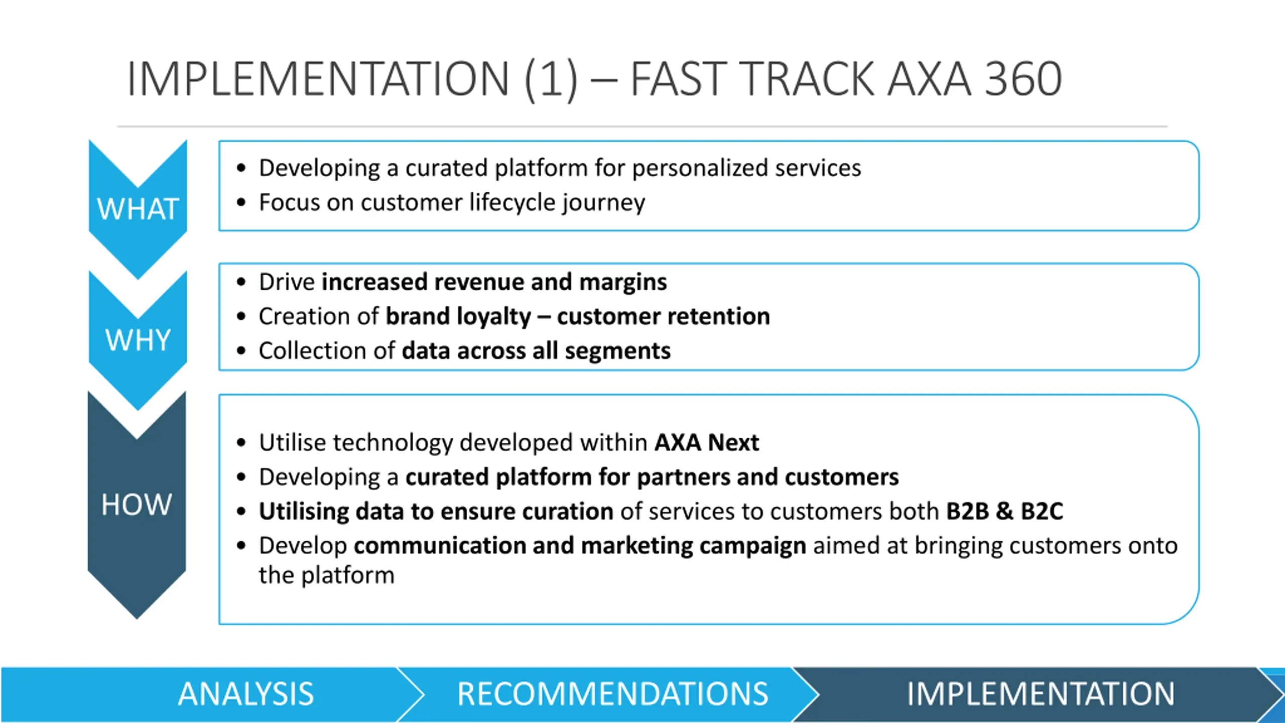 IMPLEMENTATION (1) FAST TRACK AXA 360 Developing a curated platform for personalized services Focus on customer lifecycle journey WHAT Drive increased revenue and margins Creation of brand loyalty customer retention Collection of data across all segments WHY Utilise technology developed within AXA Next Developing a curated platform for partners and customers Utilising data to ensure curation of services to customers both B2B & B2C Develop communication and marketing campaign aimed at bringing customers onto the platform HOW ANALYSIS RECOMMENDATIONS IMPLEMENTATION