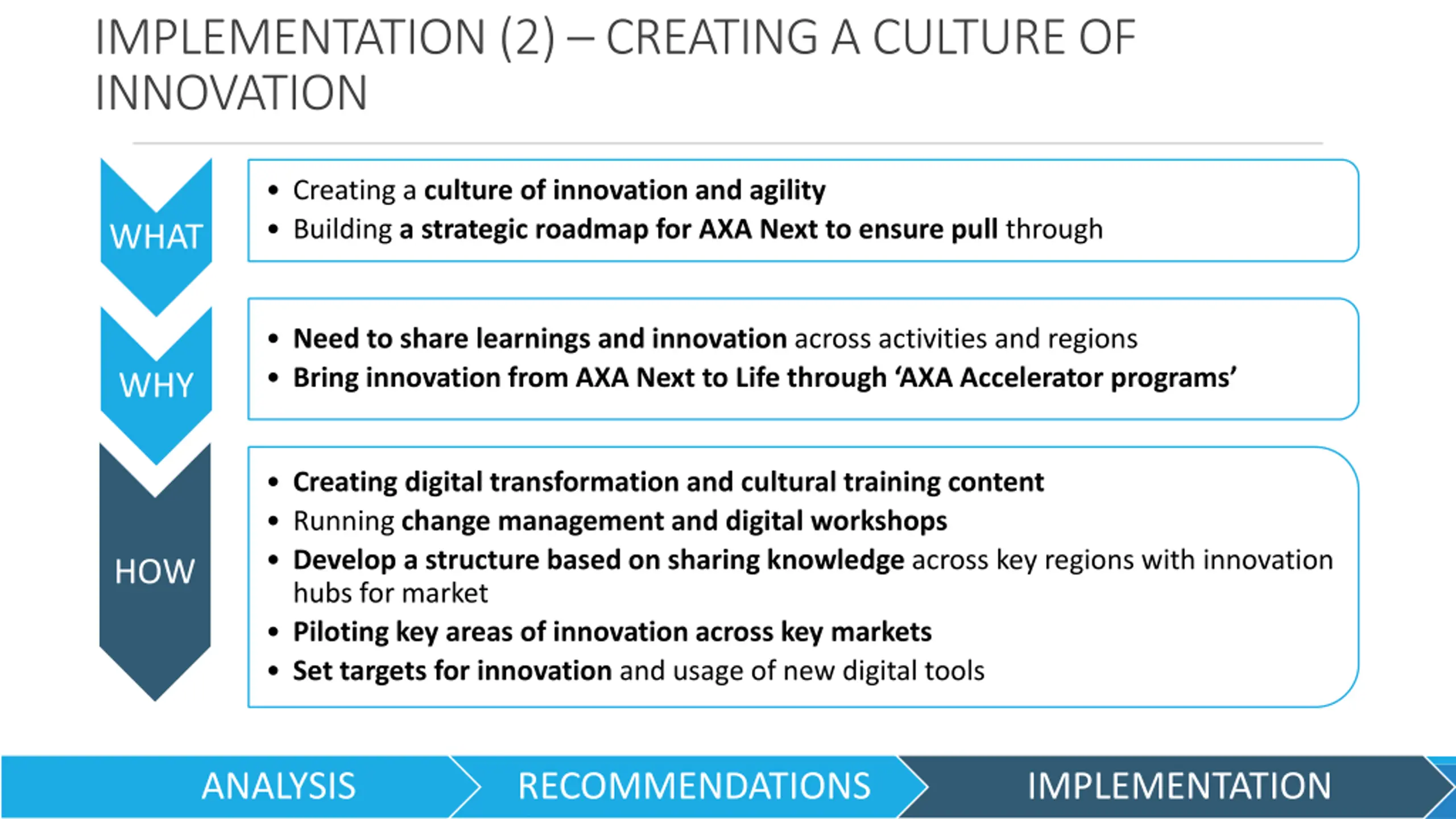 IMPLEMENTATION (2) CREATING A CULTURE OF INNOVATION Creating a culture of innovation and agility Building a strategic roadmap for AXA Next to ensure pull through WHAT Need to share learnings and innovation across activities and regions Bring innovation from AXA Next to Life through AXA Accelerator programs WHY Creating digital transformation and cultural training content Running change management and digital workshops Develop a structure based on sharing knowledge across key regions with innovation hubs for market Piloting key areas of innovation across key markets Set targets for innovation and usage of new digital tools HOW ANALYSIS RECOMMENDATIONS IMPLEMENTATION