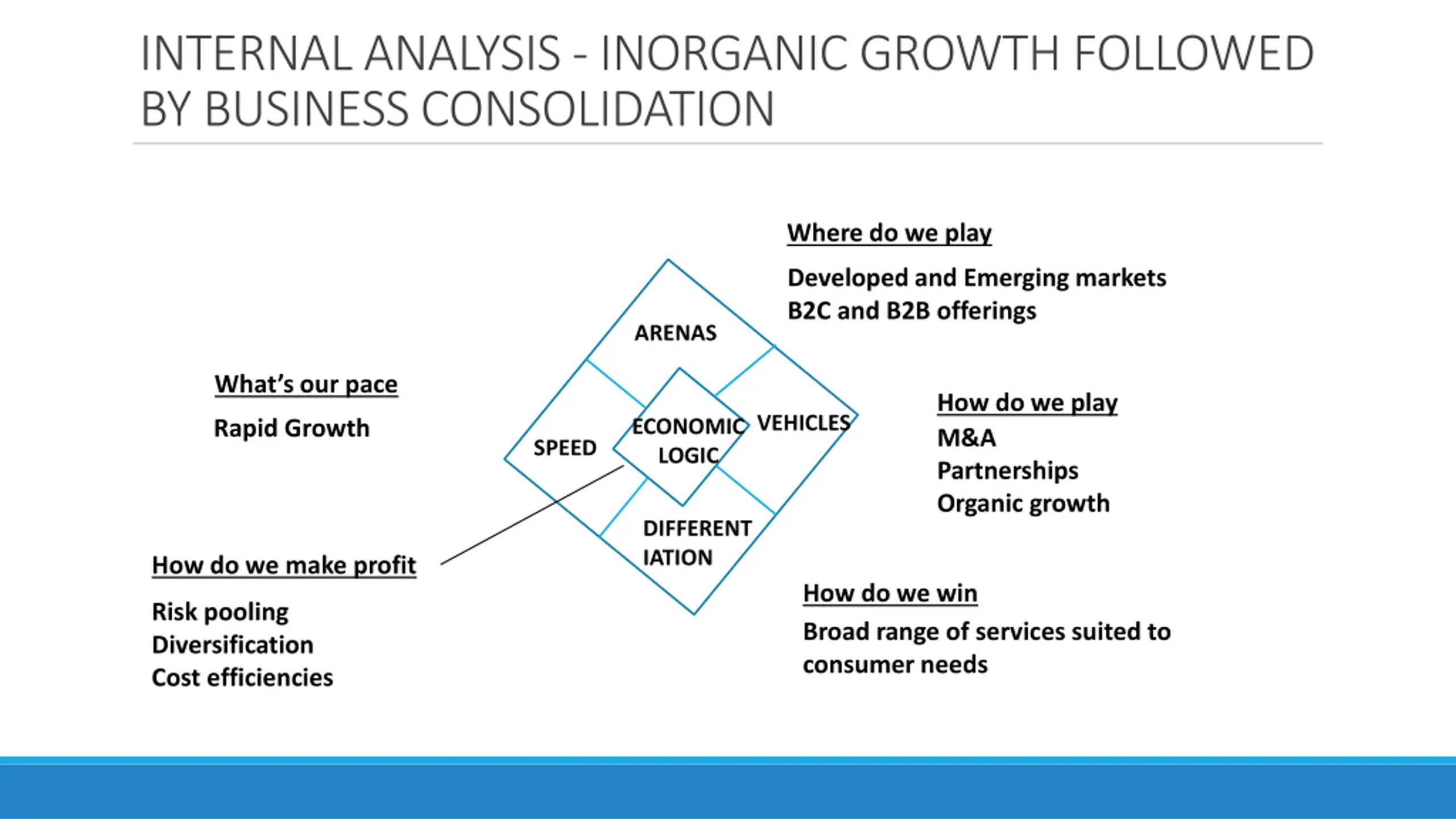 INTERNAL ANALYSIS -INORGANIC GROWTH FOLLOWED BY BUSINESS CONSOLIDATION Where do we play Developed and Emerging markets B2C and B2B offerings ARENAS What s our pace How do we play M&A Partnerships Organic growth VEHICLES ECONOMIC LOGIC Rapid Growth SPEED DIFFERENT IATION How do we make profit How do we win Broad range of services suited to consumer needs Risk pooling Diversification Cost efficiencies