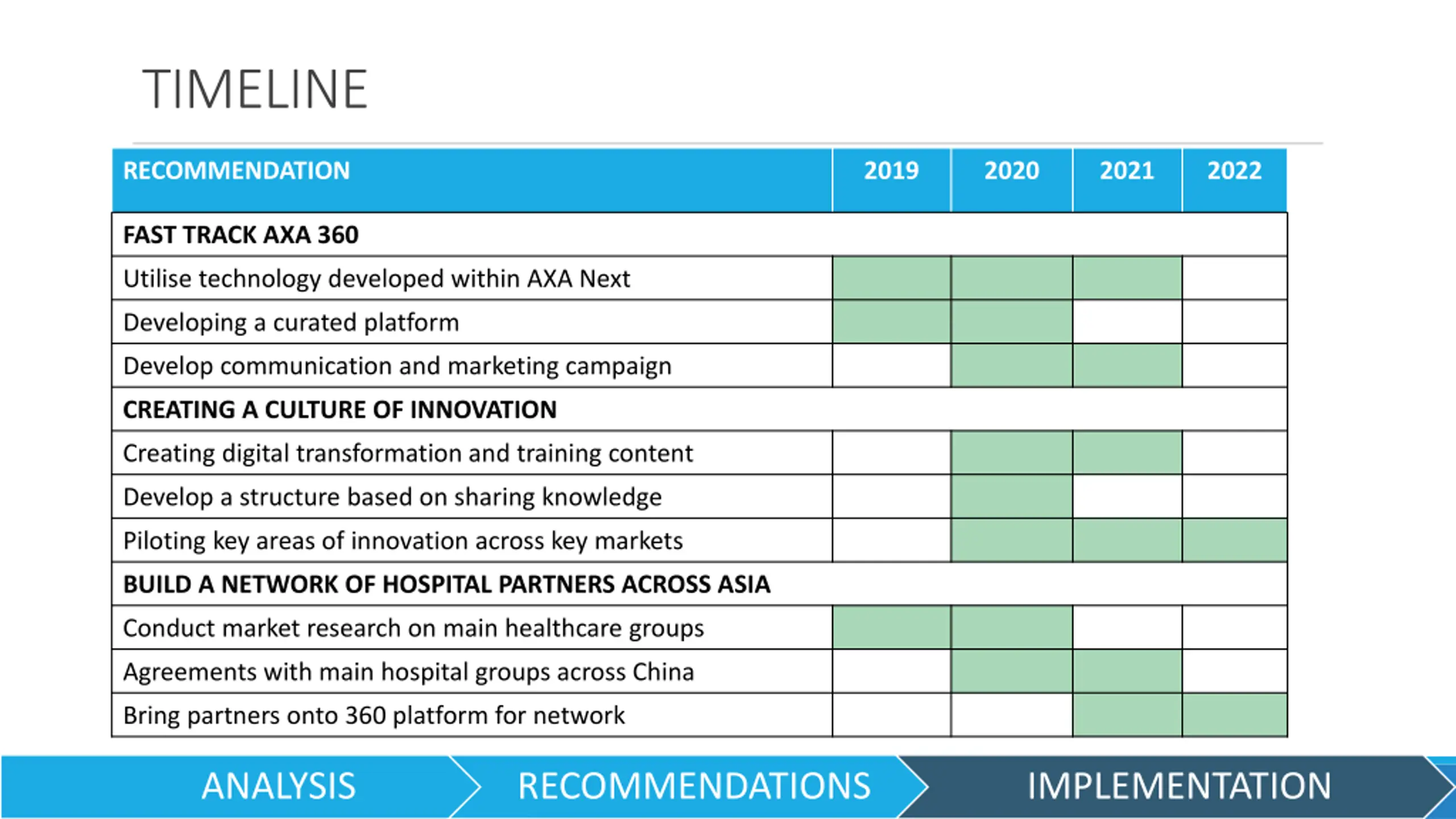 TIMELINE RECOMMENDATION 2019 2020 2021 2022 FAST TRACK AXA 360 Utilise technology developed within AXA Next Developing a curated platform Develop communication and marketing campaign CREATING A CULTURE OF INNOVATION Creating digital transformation and training content Develop a structure based on sharing knowledge Piloting key areas of innovation across key markets BUILD A NETWORK OF HOSPITAL PARTNERS ACROSS ASIA Conduct market research on main healthcare groups Agreementswith main hospital groups across China Bring partners onto 360 platform for network ANALYSIS RECOMMENDATIONS IMPLEMENTATION