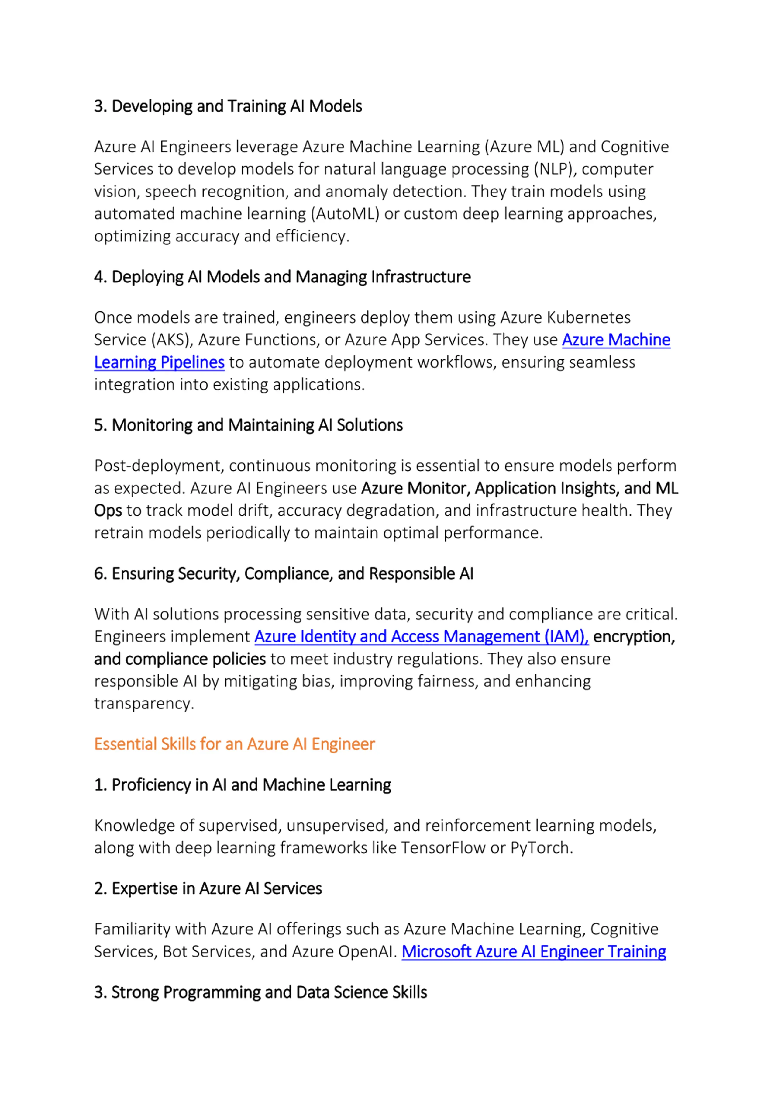 3. Dev 3. Developing and Training AI Models eloping and Training AI Models Azure AI Engineers leverage Azure Machine Learning (Azure ML) and Cognitive Services to develop models for natural language processing (NLP), computer vision, speech recognition, and anomaly detection. They train models using automated machine learning (AutoML) or custom deep learning approaches, optimizing accuracy and efficiency. 4. Deploying AI Models and Managing Infrastructure 4. Deploying AI Models and Managing Infrastructure Once models are trained, engineers deploy them using Azure Kubernetes Service (AKS), Azure Functions, or Azure App Services. They use Azure Machine Learning Pipelines Learning Pipelines to automate deployment workflows, ensuring seamless integration into existing applications. Azure Machine 5. Monitoring an 5. Monitoring and Maintaining AI Solutions d Maintaining AI Solutions Post-deployment, continuous monitoring is essential to ensure models perform as expected. Azure AI Engineers use Azure Monitor, Application Insights, and ML Azure Monitor, Application Insights, and ML Ops Ops to track model drift, accuracy degradation, and infrastructure health. They retrain models periodically to maintain optimal performance. 6. Ensuring Security, Compliance, and Responsible AI 6. Ensuring Security, Compliance, and Responsible AI With AI solutions processing sensitive data, security and compliance are critical. Engineers implement Azure Identity and Access Management (IAM), Azure Identity and Access Management (IAM), encryption, and compliance policies and compliance policies to meet industry regulations. They also ensure responsible AI by mitigating bias, improving fairness, and enhancing transparency. encryption, Essen Essential Skills for an Azure AI Engineer tial Skills for an Azure AI Engineer 1. Proficiency in AI and Machine Learning 1. Proficiency in AI and Machine Learning Knowledge of supervised, unsupervised, and reinforcement learning models, along with deep learning frameworks like TensorFlow or PyTorch. 2. Expertise in Azure AI Services 2. Expertise in Azure AI Services Familiarity with Azure AI offerings such as Azure Machine Learning, Cognitive Services, Bot Services, and Azure OpenAI. Microsoft Azure AI Engineer Training Microsoft Azure AI Engineer Training 3. Strong Programming and D 3. Strong Programming and Data Science Skills ata Science Skills