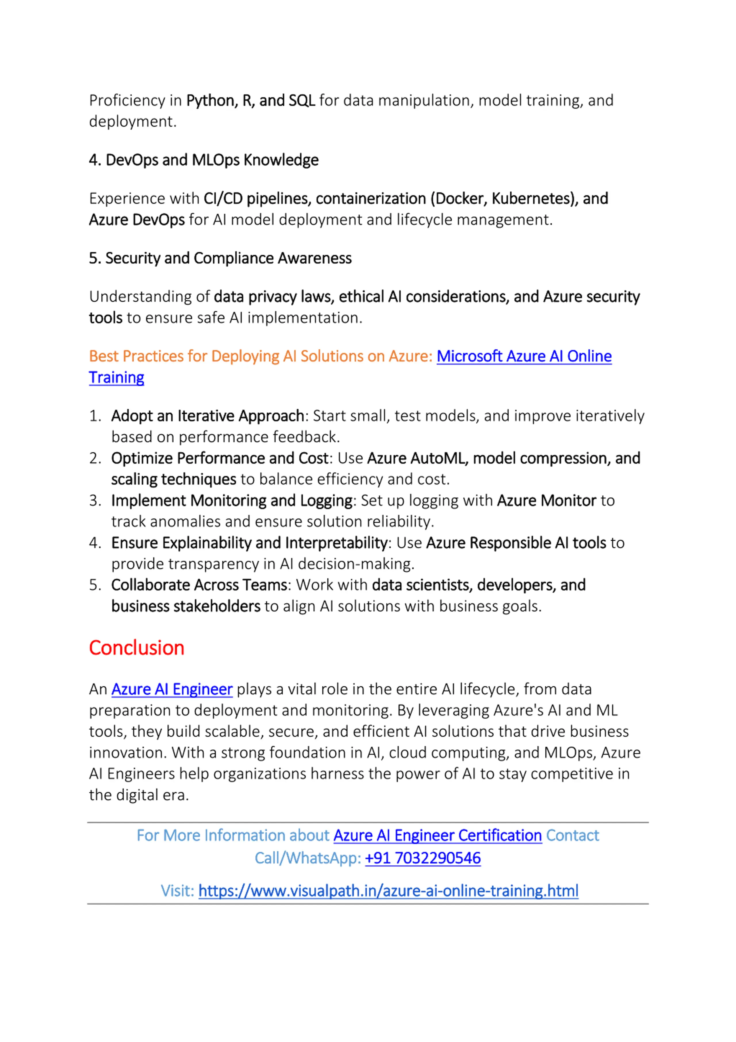 Proficiency in Python, R, and SQL Python, R, and SQL for data manipulation, model training, and deployment. 4. DevOps and MLOps Knowledge 4. DevOps and MLOps Knowledge Experience with CI/CD pipelines, containerization (Docker, Kubernetes), and CI/CD pipelines, containerization (Docker, Kubernetes), and Azure DevOps Azure DevOps for AI model deployment and lifecycle management. 5. Security and Compliance Awareness 5. Security and Compliance Awareness Understanding of data privacy laws, ethical AI considerations, and Azure security data privacy laws, ethical AI considerations, and Azure security tools tools to ensure safe AI implementation. Best Practices for Deploying AI Solutions on A Best Practices for Deploying AI Solutions on Azure Training Training zure: : Microsoft Azure AI Online Microsoft Azure AI Online 1.Adopt an Iterative Approach Adopt an Iterative Approach: Start small, test models, and improve iteratively based on performance feedback. 2.Optimize Performance and Cost Optimize Performance and Cost: Use Azure AutoML, model compression, and Azure AutoML, model compression, and scaling techniques scaling techniques to balance efficiency and cost. 3.Implement Monitoring and Logging Implement Monitoring and Logging: Set up logging with Azure Monitor track anomalies and ensure solution reliability. 4.Ensure Explainability and Interpretability Ensure Explainability and Interpretability: Use Azure Responsible AI tools provide transparency in AI decision-making. 5.Collaborate Across Teams Collaborate Across Teams: Work with data scientists, developers, and business stakeholders business stakeholders to align AI solutions with business goals. Azure Monitor to Azure Responsible AI tools to data scientists, developers, and Conclusion Conclusion An Azure AI Engineer Azure AI Engineer plays a vital role in the entire AI lifecycle, from data preparation to deployment and monitoring. By leveraging Azure's AI and ML tools, they build scalable, secure, and efficient AI solutions that drive business innovation. With a strong foundation in AI, cloud computing, and MLOps, Azure AI Engineers help organizations harness the power of AI to stay competitive in the digital era. For More Information about For More Information about Azure AI Engineer Certification Azure AI Engineer Certification Contact Call/WhatsApp: Call/WhatsApp: +91 7032290546 +91 7032290546 Contact Visit: Visit: https://www.visualpath.in/azure https://www.visualpath.in/azure- -ai ai- -online online- -training.html training.html