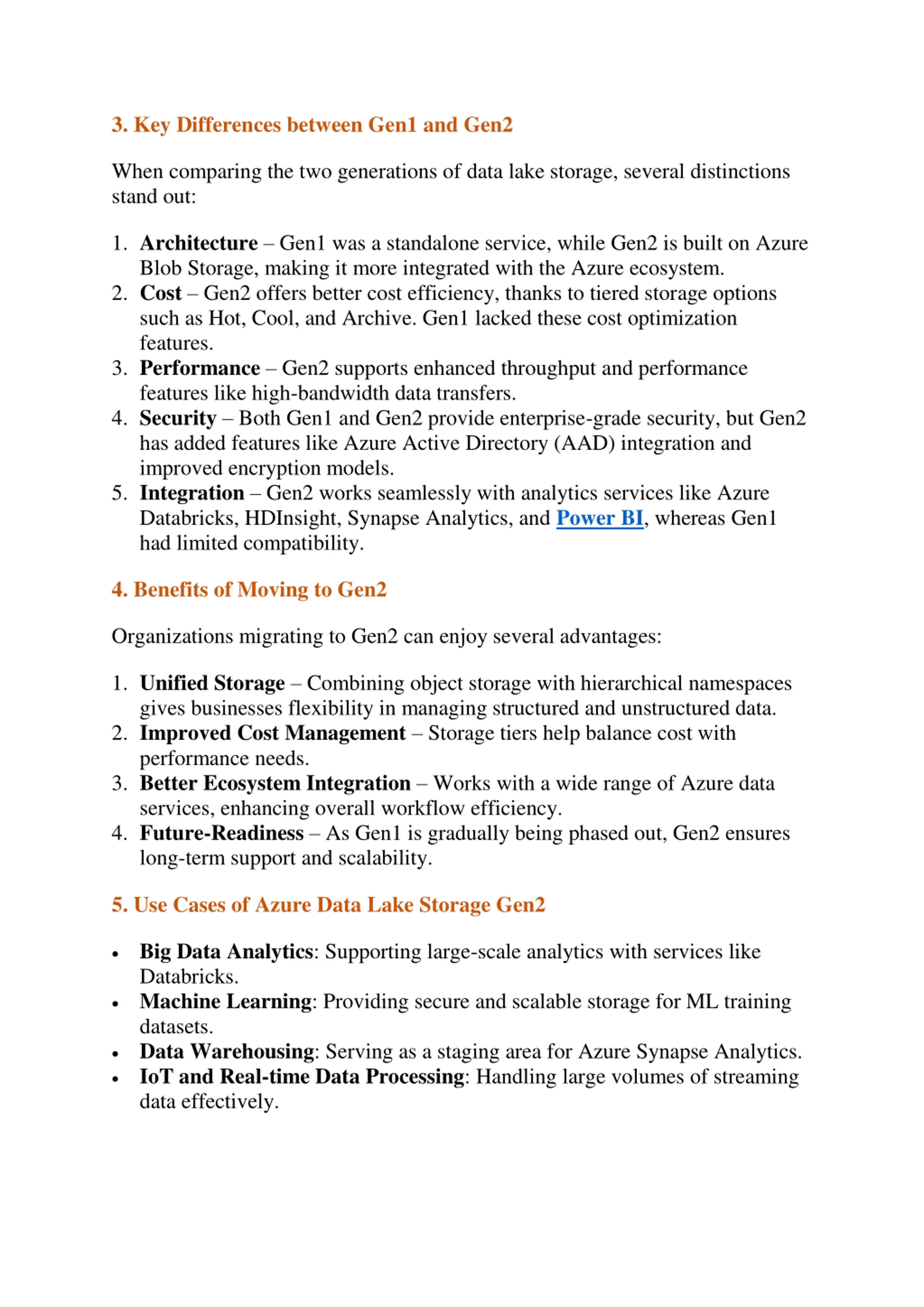 3. Key Differences between Gen1 and Gen2 When comparing the two generations of data lake storage, several distinctions stand out: 1.Architecture Gen1 was a standalone service, while Gen2 is built on Azure Blob Storage, making it more integrated with the Azure ecosystem. 2.Cost Gen2 offers better cost efficiency, thanks to tiered storage options such as Hot, Cool, and Archive. Gen1 lacked these cost optimization features. 3.Performance Gen2 supports enhanced throughput and performance features like high-bandwidth data transfers. 4.Security Both Gen1 and Gen2 provide enterprise-grade security, but Gen2 has added features like Azure Active Directory (AAD) integration and improved encryption models. 5.Integration Gen2 works seamlessly with analytics services like Azure Databricks, HDInsight, Synapse Analytics, and Power BI, whereas Gen1 had limited compatibility. 4. Benefits of Moving to Gen2 Organizations migrating to Gen2 can enjoy several advantages: 1.Unified Storage Combining object storage with hierarchical namespaces gives businesses flexibility in managing structured and unstructured data. 2.Improved Cost Management Storage tiers help balance cost with performance needs. 3.Better Ecosystem Integration Works with a wide range of Azure data services, enhancing overall workflow efficiency. 4.Future-Readiness As Gen1 is gradually being phased out, Gen2 ensures long-term support and scalability. 5. Use Cases of Azure Data Lake Storage Gen2 Big Data Analytics: Supporting large-scale analytics with services like Databricks. Machine Learning: Providing secure and scalable storage for ML training datasets. Data Warehousing: Serving as a staging area for Azure Synapse Analytics. IoT and Real-time Data Processing: Handling large volumes of streaming data effectively.