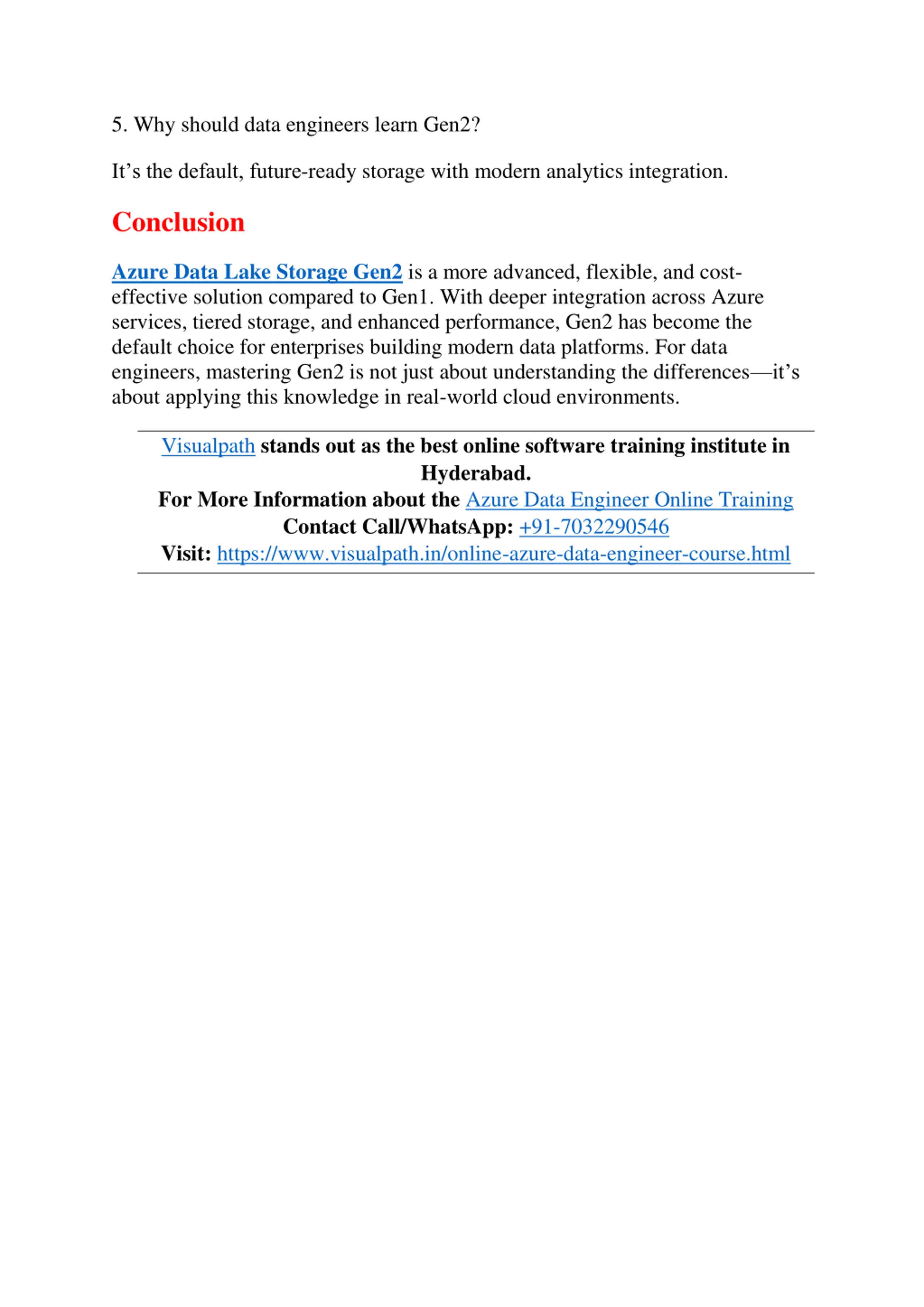 5. Why should data engineers learn Gen2? It s the default, future-ready storage with modern analytics integration. Conclusion Azure Data Lake Storage Gen2 is a more advanced, flexible, and cost- effective solution compared to Gen1. With deeper integration across Azure services, tiered storage, and enhanced performance, Gen2 has become the default choice for enterprises building modern data platforms. For data engineers, mastering Gen2 is not just about understanding the differences it s about applying this knowledge in real-world cloud environments. Visualpath stands out as the best online software training institute in Hyderabad. For More Information aboutthe Azure Data Engineer Online Training Contact Call/WhatsApp: +91-7032290546 Visit: https://www.visualpath.in/online-azure-data-engineer-course.html