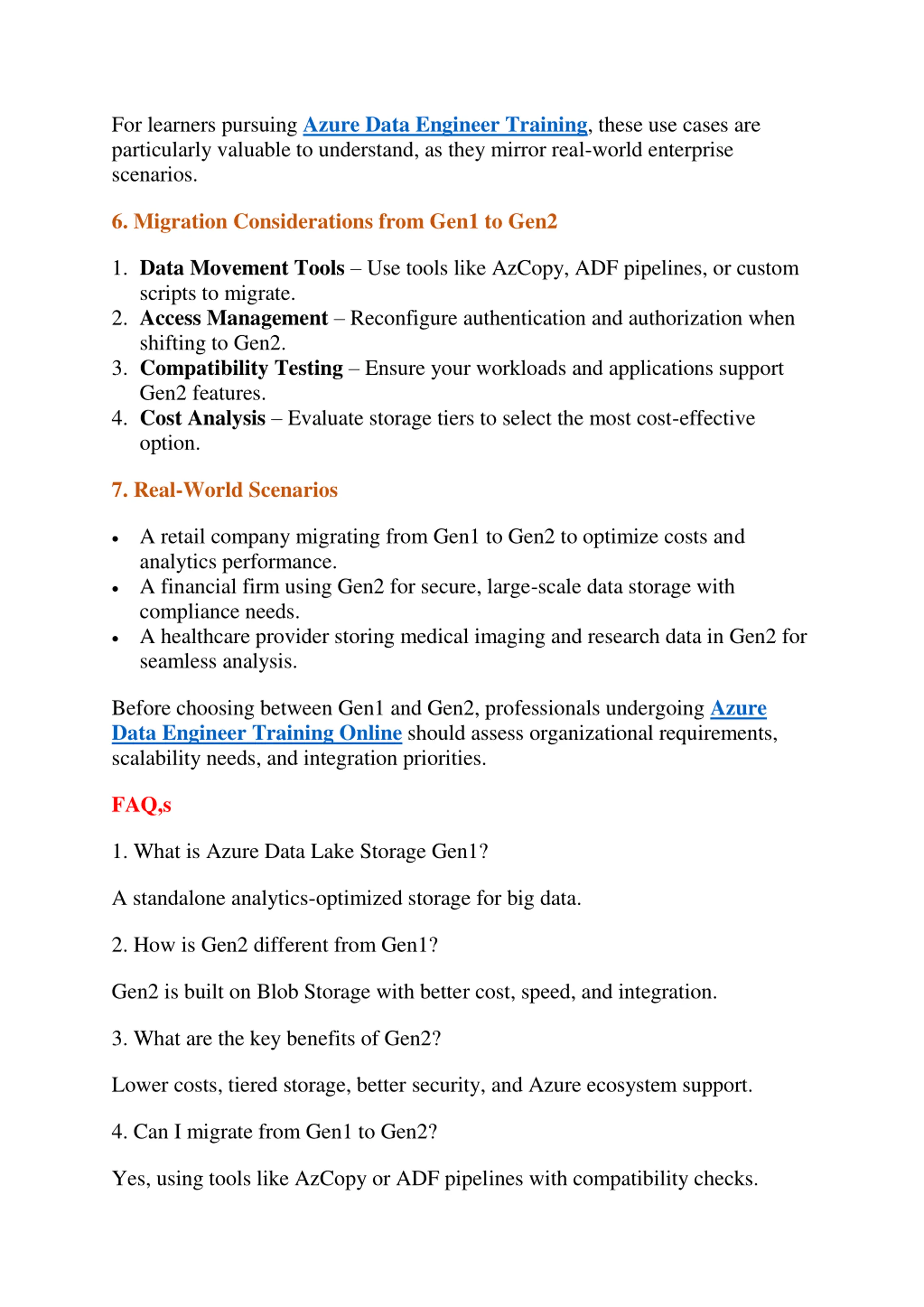 For learners pursuing Azure Data Engineer Training, these use cases are particularly valuable to understand, as they mirror real-world enterprise scenarios. 6. Migration Considerations from Gen1 to Gen2 1.Data Movement Tools Use tools like AzCopy, ADF pipelines, or custom scripts to migrate. 2.Access Management Reconfigure authentication and authorization when shifting to Gen2. 3.Compatibility Testing Ensure your workloads and applications support Gen2 features. 4.Cost Analysis Evaluate storage tiers to select the most cost-effective option. 7. Real-World Scenarios A retail company migrating from Gen1 to Gen2 to optimize costs and analytics performance. A financial firm using Gen2 for secure, large-scale data storage with compliance needs. A healthcare provider storing medical imaging and research data in Gen2 for seamless analysis. Before choosing between Gen1 and Gen2, professionals undergoing Azure Data Engineer Training Online should assess organizational requirements, scalability needs, and integration priorities. FAQ,s 1. What is Azure Data Lake Storage Gen1? A standalone analytics-optimized storage for big data. 2. How is Gen2 different from Gen1? Gen2 is built on Blob Storage with better cost, speed, and integration. 3. What are the key benefits of Gen2? Lower costs, tiered storage, better security, and Azure ecosystem support. 4. Can I migrate from Gen1 to Gen2? Yes, using tools like AzCopy or ADF pipelines with compatibility checks.