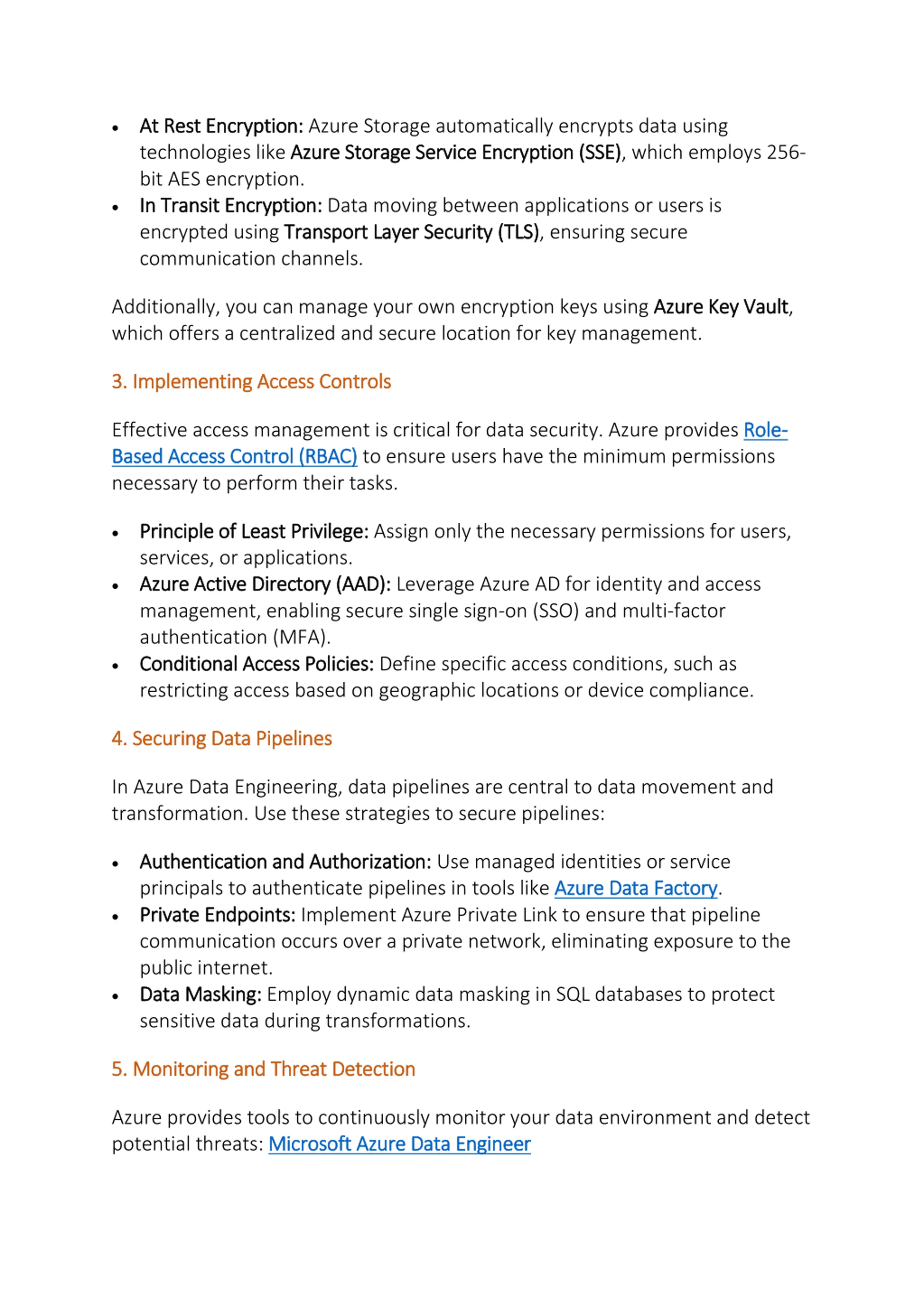 At Rest Encryption: At Rest Encryption: Azure Storage automatically encrypts data using technologies like Azure Storage Service Encryption (SSE) Azure Storage Service Encryption (SSE), which employs 256- bit AES encryption. In Transit Encryption: In Transit Encryption: Data moving between applications or users is encrypted using Transport Layer Security (TLS) Transport Layer Security (TLS), ensuring secure communication channels. Additionally, you can manage your own encryption keys using Azure Key Va which offers a centralized and secure location for key management. Azure Key Vault ult, 3. Implementing Access Controls 3. Implementing Access Controls Effective access management is critical for data security. Azure provides Role Based Access Control (RBAC) Based Access Control (RBAC) to ensure users have the minimum permissions necessary to perform their tasks. Role- - Principle of Least Privilege: Principle of Least Privilege: Assign only the necessary permissions for users, services, or applications. Azure Active Directory (AAD): Azure Active Directory (AAD): Leverage Azure AD for identity and access management, enabling secure single sign-on (SSO) and multi-factor authentication (MFA). Conditional Access Policies: Conditional Access Policies: Define specific access conditions, such as restricting access based on geographic locations or device compliance. 4. Securing Data Pipelines 4. Securing Data Pipelines In Azure Data Engineering, data pipelines are central to data movement and transformation. Use these strategies to secure pipelines: Authentication and Authorization: Authentication and Authorization: Use managed identities or service principals to authenticate pipelines in tools like Azure Data Factory Private Endpoints: Private Endpoints: Implement Azure Private Link to ensure that pipeline communication occurs over a private network, eliminating exposure to the public internet. Data Masking: Data Masking: Employ dynamic data masking in SQL databases to protect sensitive data during transformations. Azure Data Factory. 5. Monitoring and Threat Detection 5. Monitoring and Threat Detection Azure provides tools to continuously monitor your data environment and detect potential threats: Microsoft Azure Data Engineer Microsoft Azure Data Engineer