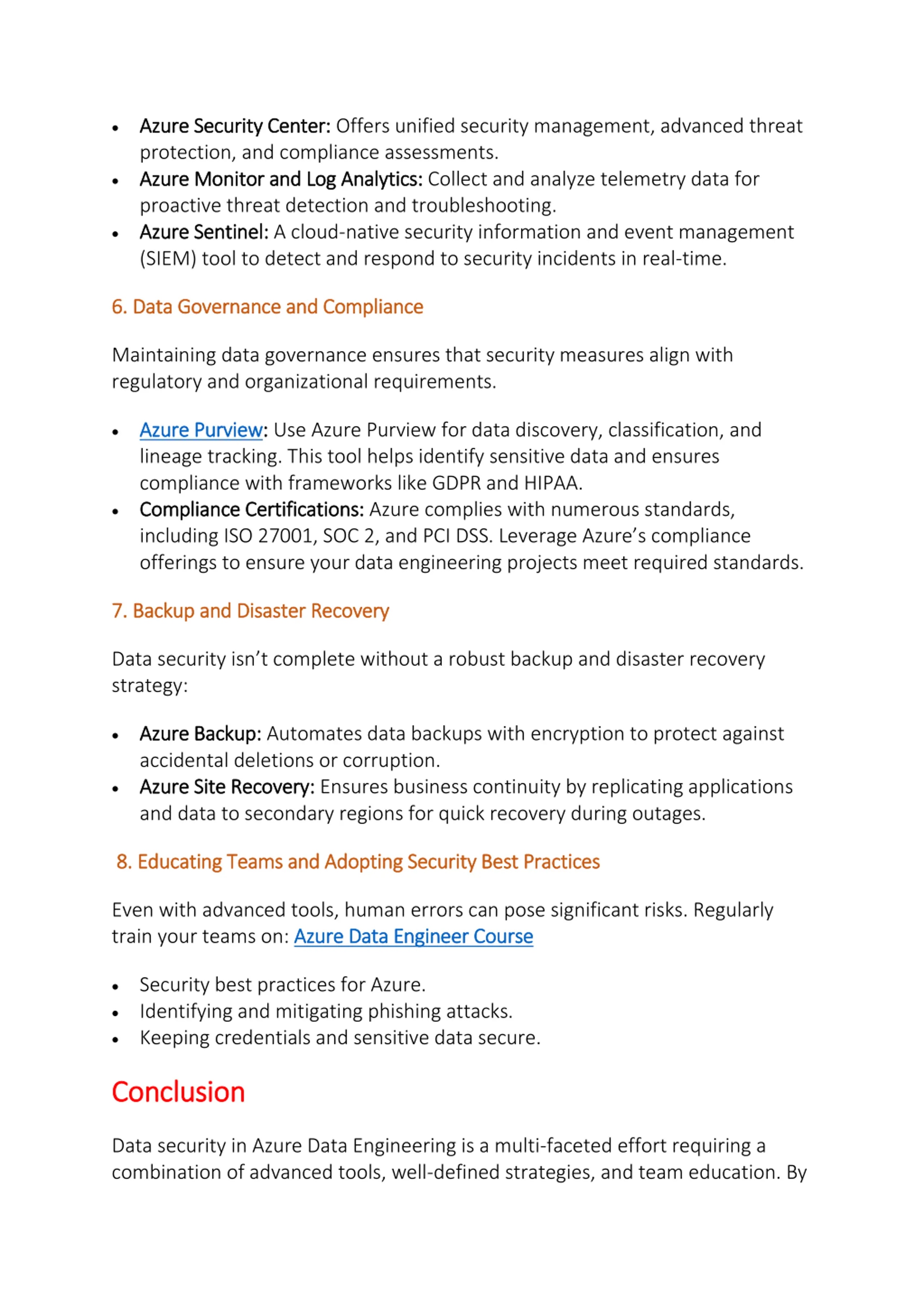 Azure Security Center: Azure Security Center: Offers unified security management, advanced threat protection, and compliance assessments. Azure Monitor and Log Analytics: Azure Monitor and Log Analytics: Collect and analyze telemetry data for proactive threat detection and troubleshooting. Azure Sentinel: Azure Sentinel: A cloud-native security information and event management (SIEM) tool to detect and respond to security incidents in real-time. 6. Data Governance and Compliance 6. Data Governance and Compliance Maintaining data governance ensures that security measures align with regulatory and organizational requirements. Azure Purview Azure Purview: : Use Azure Purview for data discovery, classification, and lineage tracking. This tool helps identify sensitive data and ensures compliance with frameworks like GDPR and HIPAA. Compliance Certifications: Compliance Certifications: Azure complies with numerous standards, including ISO 27001, SOC 2, and PCI DSS. Leverage Azure s compliance offerings to ensure your data engineering projects meet required standards. 7. Backup and Disaster Recovery 7. Backup and Disaster Recovery Data security isn t complete without a robust backup and disaster recovery strategy: Azure Backup: Azure Backup: Automates data backups with encryption to protect against accidental deletions or corruption. Azure Site Recovery: Azure Site Recovery: Ensures business continuity by replicating applications and data to secondary regions for quick recovery during outages. 8. Educating Teams and Adopting Security Best Practices 8. Educating Teams and Adopting Security Best Practices Even with advanced tools, human errors can pose significant risks. Regularly train your teams on: Azure Dat Azure Data Engineer Course a Engineer Course Security best practices for Azure. Identifying and mitigating phishing attacks. Keeping credentials and sensitive data secure. Conclusion Conclusion Data security in Azure Data Engineering is a multi-faceted effort requiring a combination of advanced tools, well-defined strategies, and team education. By