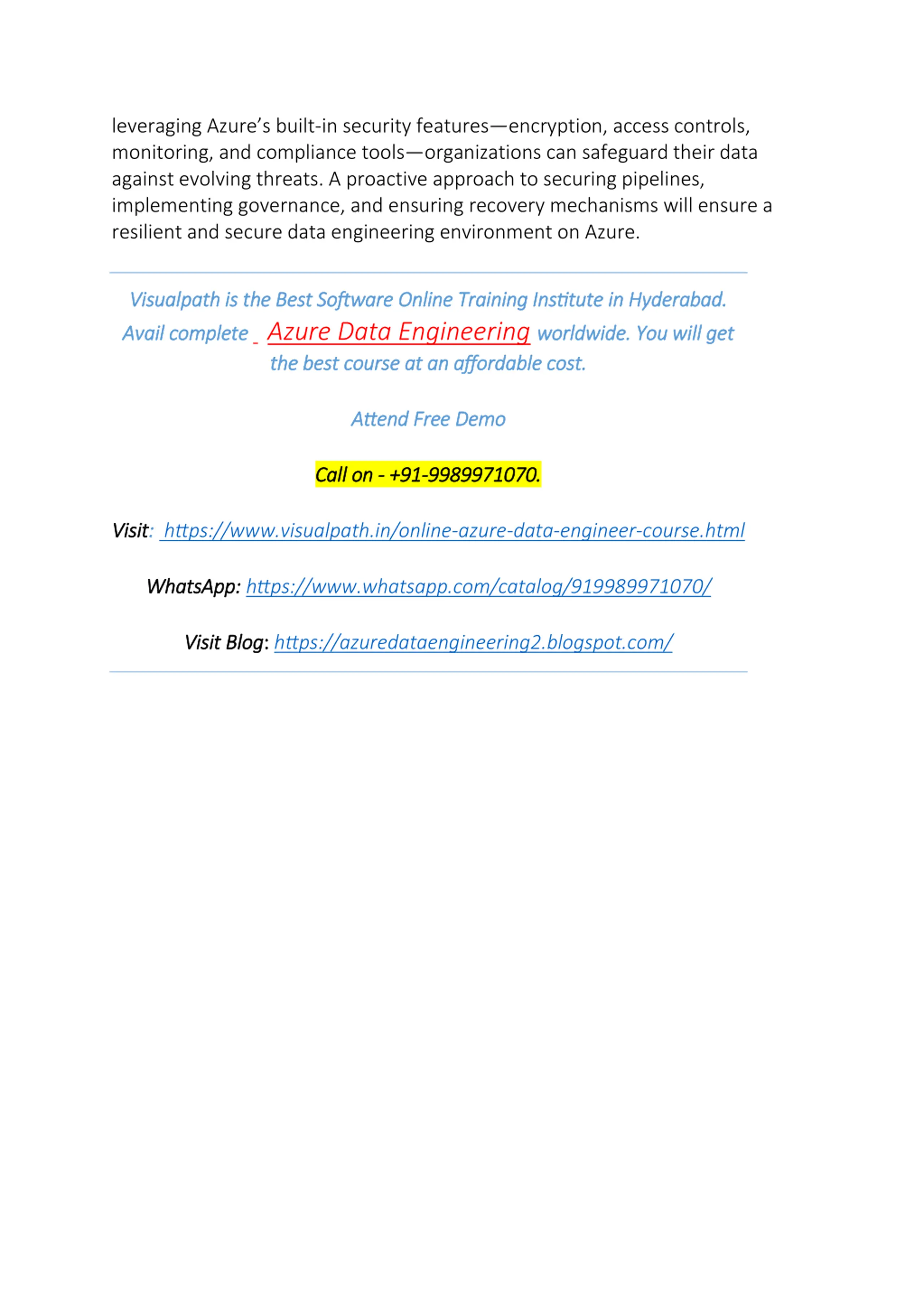 leveraging Azures built-in security featuresencryption, access controls, monitoring, and compliance tools organizations can safeguard their data against evolving threats. A proactive approach to securing pipelines, implementing governance, and ensuring recovery mechanisms will ensure a resilient and secure data engineering environment on Azure. Visualpath is the Best Software Online Training Institute in Hyderabad. Visualpath is the Best Software Online Training Institute in Hyderabad. Avail complete Azure Data Engineering worldwide. You will get the best course at an the best course at an affordable cost. Avail complete worldwide. You will get affordable cost. Attend Free Demo Attend Free Demo Call on Call on - - +91 +91- -9989971070. 9989971070. Visit Visit: : https://www.visualpath.in/online-azure-data-engineer-course.html WhatsApp: WhatsApp: https://www.whatsapp.com/catalog/919989971070/ Visit Blog Visit Blog: : https://azuredataengineering2.blogspot.com/