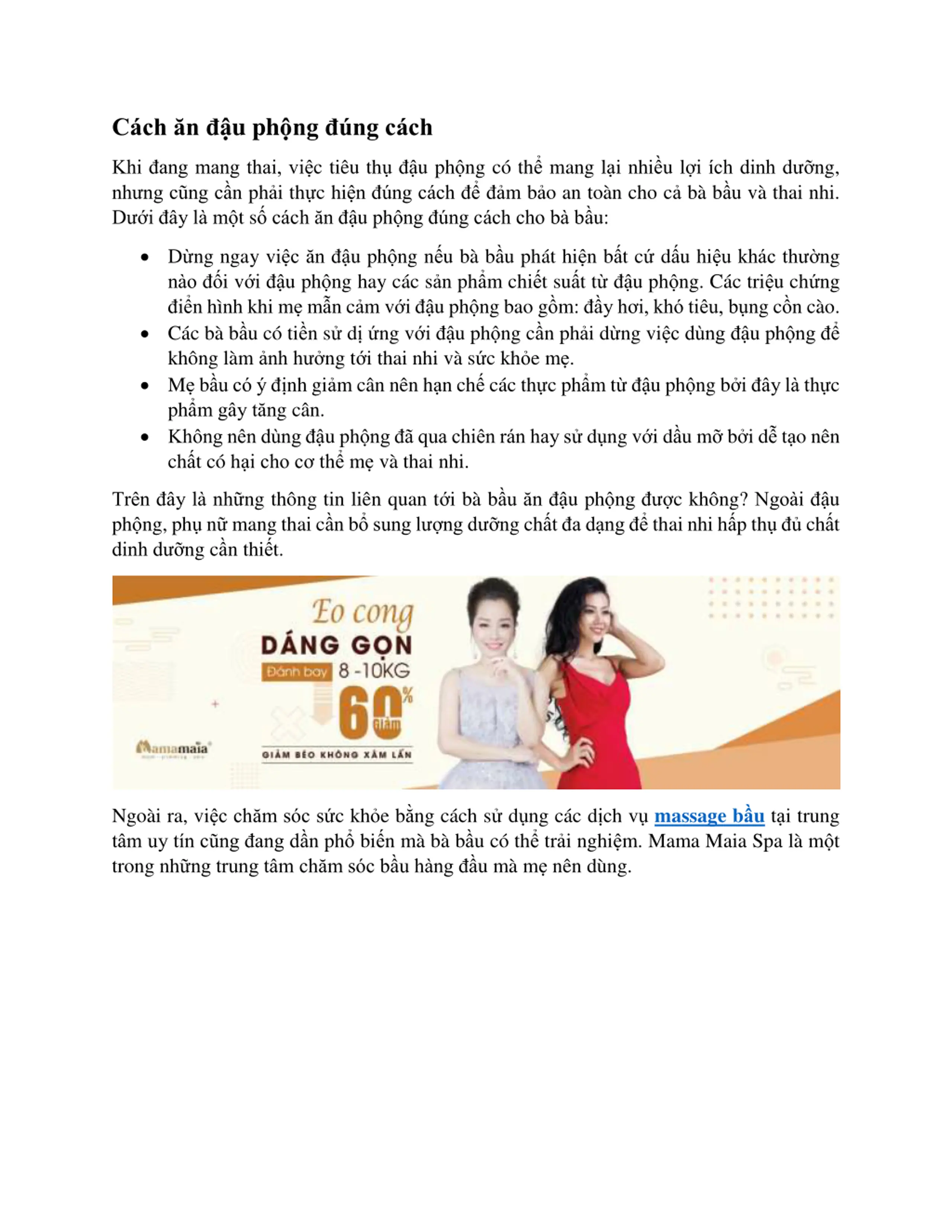 Cch n u phng ng cch Khi ang mang thai, vi c ti u th u ph ng c th mang l i nhi u l i ch dinh d ng, nh ng c ng c n ph i th c hi n ng c ch m b o an to n cho c b b u v thai nhi. D i y l m t s c ch n u ph ng ng c ch cho b b u: D ng ngay vi c n u ph ng n u b b u ph t hi n b t c d u hi u kh c th ng n o i v i u ph ng hay c c s n ph m chi t su t t u ph ng. C c tri u ch ng i n h nh khi m m n c m v i u ph ng bao g m: y h i, kh ti u, b ng c n c o. C c b b u c ti n s d ng v i u ph ng c n ph i d ng vi c d ng u ph ng kh ng l m nh h ng t i thai nhi v s c kh e m . M b u c nh gi m c n n n h n ch c c th c ph m t u ph ng b i y l th c ph m g y t ng c n. Kh ng n n d ng u ph ng qua chi n r n hay s d ng v i d u m b i d t o n n ch t c h i cho c th m v thai nhi. Tr n y l nh ng th ng tin li n quan t i b b u n u ph ng c kh ng? Ngo i u ph ng, ph n mang thai c n b sung l ng d ng ch t a d ng thai nhi h p th ch t dinh d ng c n thi t. Ngo i ra, vi c ch m s c s c kh e b ng c ch s d ng c c d ch v massage b u t i trung t m uy t n c ng ang d n ph bi n m b b u c th tr i nghi m. Mama Maia Spa l m t trong nh ng trung t m ch m s c b u h ng u m m n n d ng.