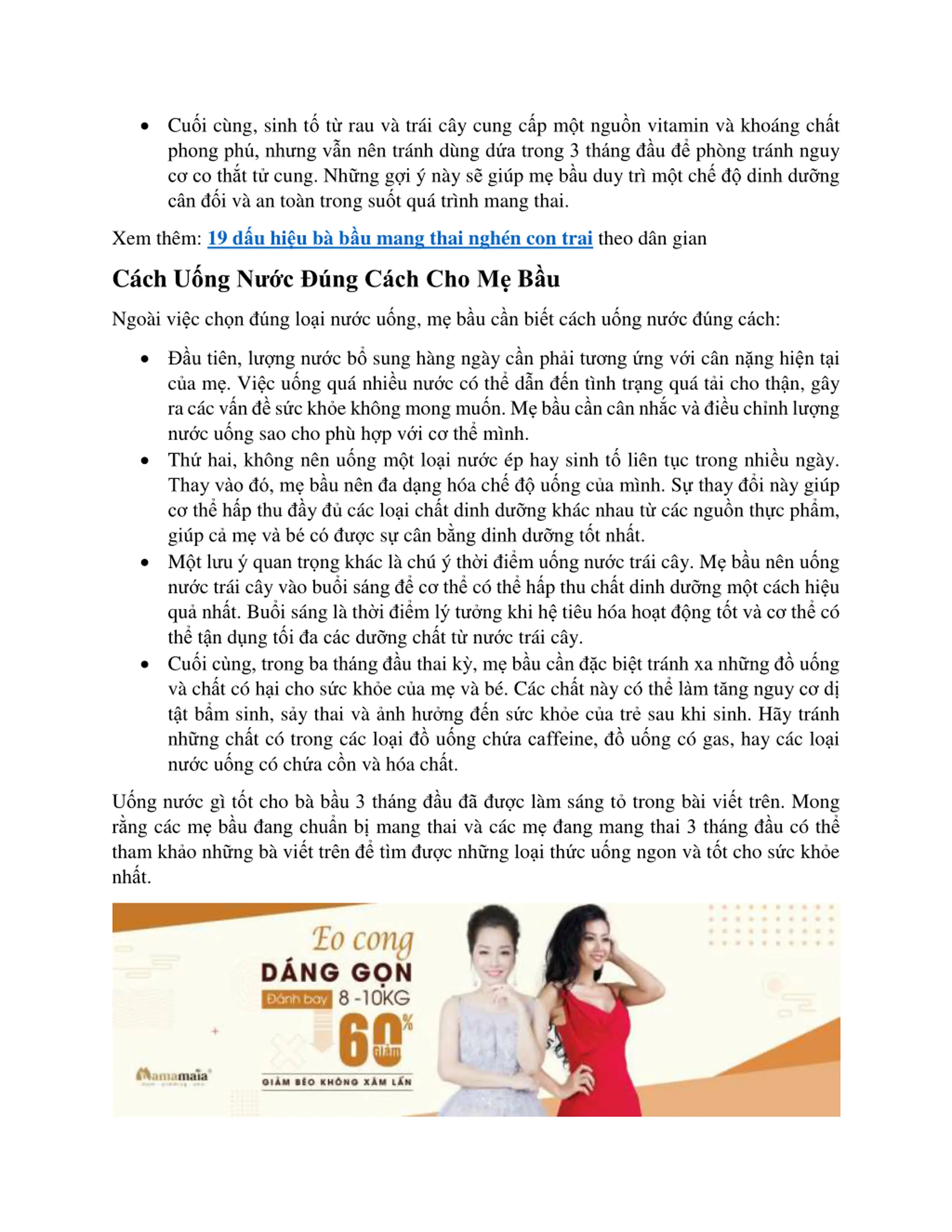 Cui cng, sinh t t rau v tri cy cung cp mt ngun vitamin v khong cht phong ph , nh ng v n n n tr nh d ng d a trong 3 th ng u ph ng tr nh nguy c co th t t cung. Nh ng g i n y s gi p m b u duy tr m t ch dinh d ng c n i v an to n trong su t qu tr nh mang thai. Xem th m: 19 d u hi u b b u mang thai ngh n con trai theo d n gian C ch U ng N c ng C ch Cho M B u Ngo i vi c ch n ng lo i n c u ng, m b u c n bi t c ch u ng n c ng c ch: u ti n, l ng n c b sung h ng ng y c n ph i t ng ng v i c n n ng hi n t i c a m . Vi c u ng qu nhi u n c c th d n n t nh tr ng qu t i cho th n, g y ra c c v n s c kh e kh ng mong mu n. M b u c n c n nh c v i u ch nh l ng n c u ng sao cho ph h p v i c th m nh. Th hai, kh ng n n u ng m t lo i n c p hay sinh t li n t c trong nhi u ng y. Thay v o , m b u n n a d ng h a ch u ng c a m nh. S thay i n y gi p c th h p thu y c c lo i ch t dinh d ng kh c nhau t c c ngu n th c ph m, gi p c m v b c c s c n b ng dinh d ng t t nh t. M t l u quan tr ng kh c l ch th i i m u ng n c tr i c y. M b u n n u ng n c tr i c y v o bu i s ng c th c th h p thu ch t dinh d ng m t c ch hi u qu nh t. Bu i s ng l th i i m l t ng khi h ti u h a ho t ng t t v c th c th t n d ng t i a c c d ng ch t t n c tr i c y. Cu i c ng, trong ba th ng u thai k , m b u c n c bi t tr nh xa nh ng u ng v ch t c h i cho s c kh e c a m v b . C c ch t n y c th l m t ng nguy c d t t b m sinh, s y thai v nh h ng n s c kh e c a tr sau khi sinh. H y tr nh nh ng ch t c trong c c lo i u ng ch a caffeine, u ng c gas, hay c c lo i n c u ng c ch a c n v h a ch t. U ng n c g t t cho b b u 3 th ng u c l m s ng t trong b i vi t tr n. Mong r ng c c m b u ang chu n b mang thai v c c m ang mang thai 3 th ng u c th tham kh o nh ng b vi t tr n t m c nh ng lo i th c u ng ngon v t t cho s c kh e nh t.