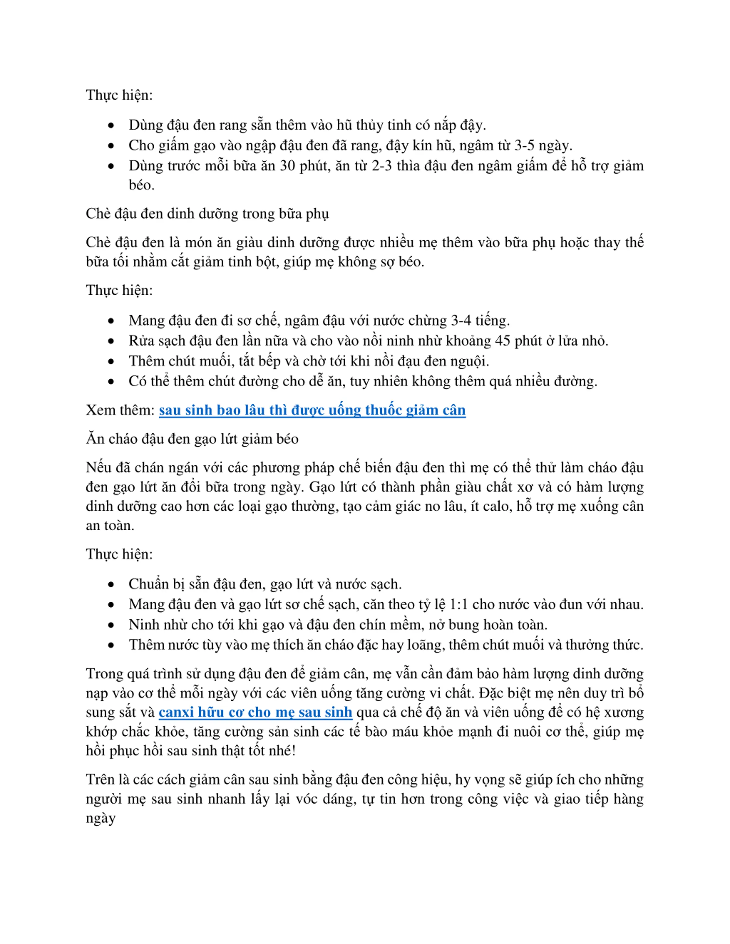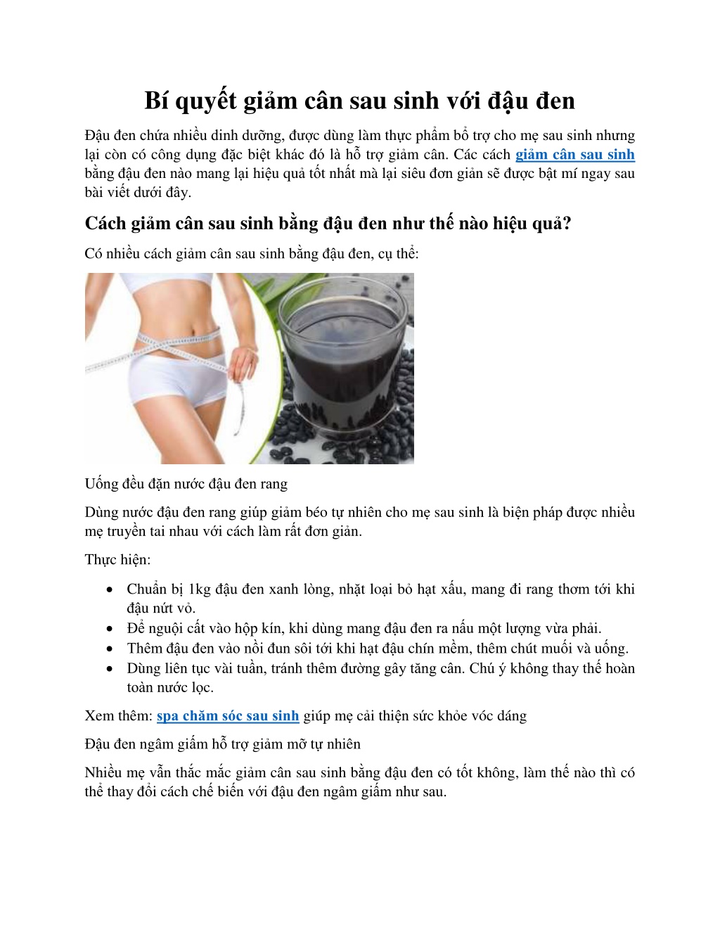 B quyt gim cn sau sinh vi u en u en ch a nhi u dinh d ng, c d ng l m th c ph m b tr cho m sau sinh nh ng l i c n c c ng d ng c bi t kh c l h tr gi m c n. C c c ch gi m c n sau sinh b ng u en n o mang l i hi u qu t t nh t m l i si u n gi n s c b t m ngay sau b i vi t d i y. C ch gi m c n sau sinh b ng u en nh th n o hi u qu ? C nhi u c ch gi m c n sau sinh b ng u en, c th : U ng u n n c u en rang D ng n c u en rang gi p gi m b o t nhi n cho m sau sinh l bi n ph p c nhi u m truy n tai nhau v i c ch l m r t n gi n. Th c hi n: Chu n b 1kg u en xanh l ng, nh t lo i b h t x u, mang i rang th m t i khi u n t v . ngu i c t v o h p k n, khi d ng mang u en ra n u m t l ng v a ph i. Th m u en v o n i un s i t i khi h t u ch n m m, th m ch t mu i v u ng. D ng li n t c v i tu n, tr nh th m ng g y t ng c n. Ch kh ng thay th ho n to n n c l c. Xem th m: spa ch m s c sau sinh gi p m c i thi n s c kh e v c d ng u en ng m gi m h tr gi m m t nhi n Nhi u m v n th c m c gi m c n sau sinh b ng u en c t t kh ng, l m th n o th c th thay i c ch ch bi n v i u en ng m gi m nh sau.