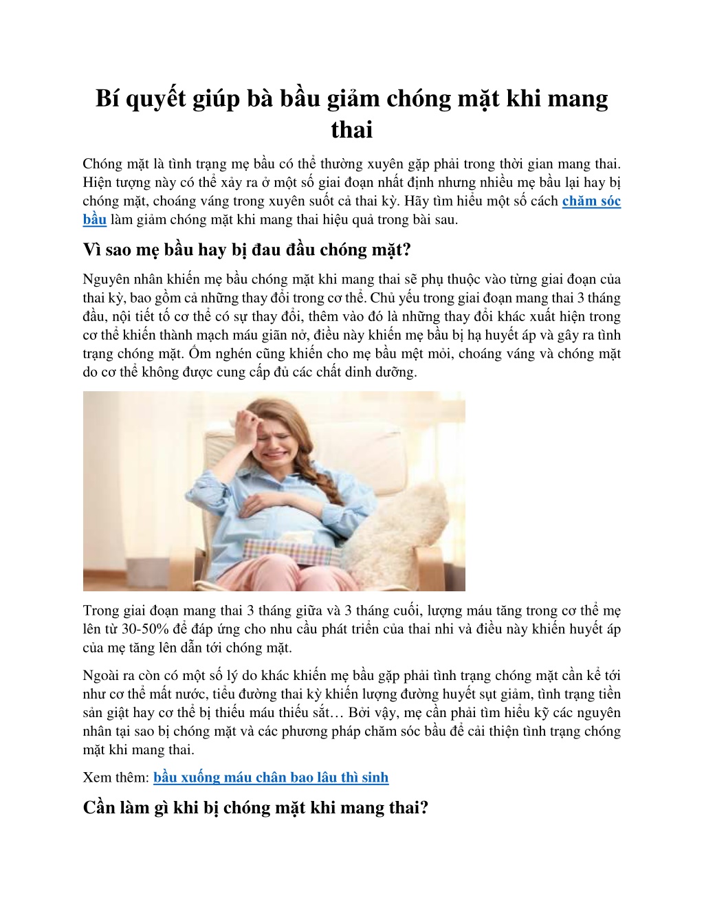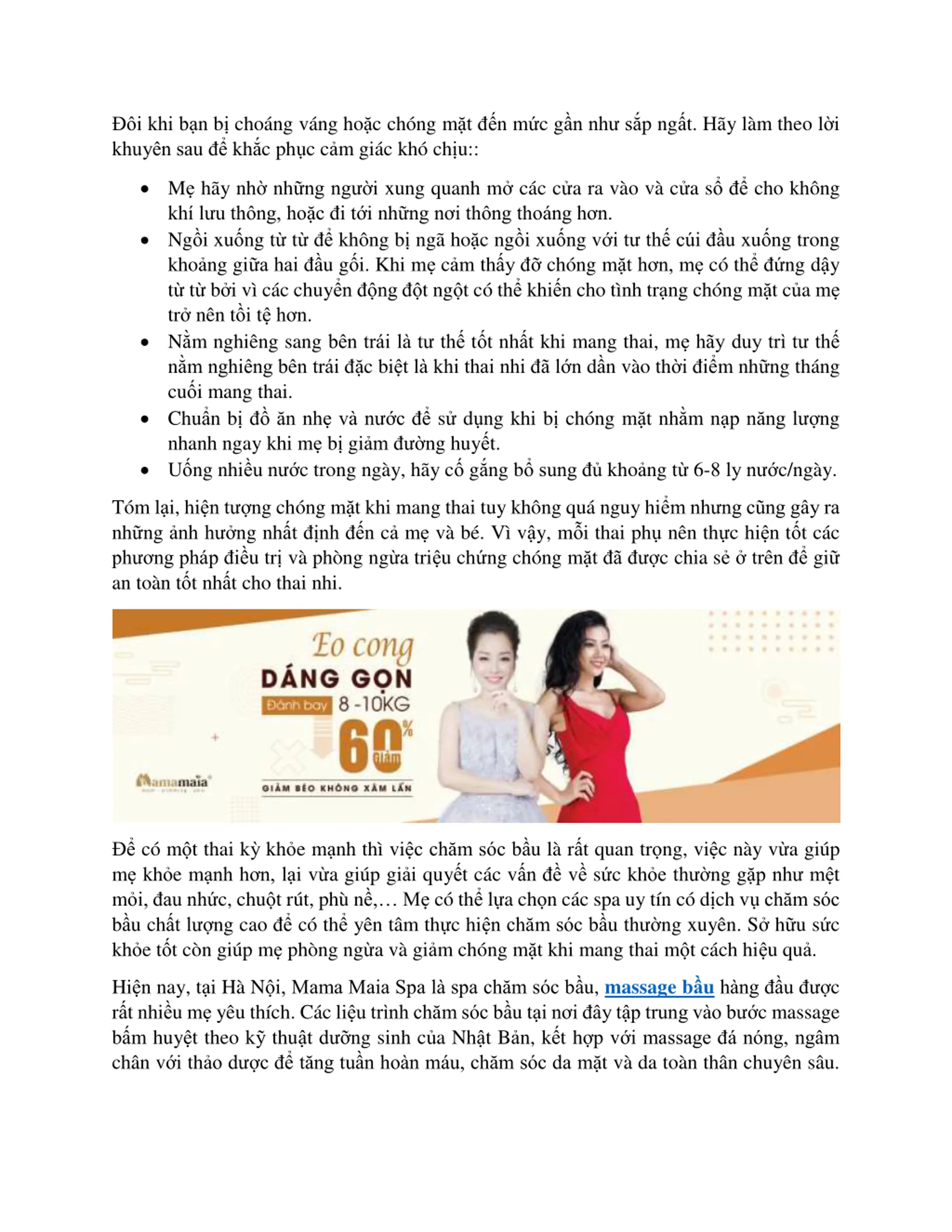 i khi bn b chong vng hoc chng mt n mc gn nh sp ngt. Hy lm theo li khuy n sau kh c ph c c m gi c kh ch u:: M h y nh nh ng ng i xung quanh m c c c a ra v o v c a s cho kh ng kh l u th ng, ho c i t i nh ng n i th ng tho ng h n. Ng i xu ng t t kh ng b ng ho c ng i xu ng v i t th c i u xu ng trong kho ng gi a hai u g i. Khi m c m th y ch ng m t h n, m c th ng d y t t b i v c c chuy n ng t ng t c th khi n cho t nh tr ng ch ng m t c a m tr n n t i t h n. N m nghi ng sang b n tr i l t th t t nh t khi mang thai, m h y duy tr t th n m nghi ng b n tr i c bi t l khi thai nhi l n d n v o th i i m nh ng th ng cu i mang thai. Chu n b n nh v n c s d ng khi b ch ng m t nh m n p n ng l ng nhanh ngay khi m b gi m ng huy t. U ng nhi u n c trong ng y, h y c g ng b sung kho ng t 6-8 ly n c/ng y. T m l i, hi n t ng ch ng m t khi mang thai tuy kh ng qu nguy hi m nh ng c ng g y ra nh ng nh h ng nh t nh n c m v b . V v y, m i thai ph n n th c hi n t t c c ph ng ph p i u tr v ph ng ng a tri u ch ng ch ng m t c chia s tr n gi an to n t t nh t cho thai nhi. c m t thai k kh e m nh th vi c ch m s c b u l r t quan tr ng, vi c n y v a gi p m kh e m nh h n, l i v a gi p gi i quy t c c v n v s c kh e th ng g p nh m t m i, au nh c, chu t r t, ph n , M c th l a ch n c c spa uy t n c d ch v ch m s c b u ch t l ng cao c th y n t m th c hi n ch m s c b u th ng xuy n. S h u s c kh e t t c n gi p m ph ng ng a v gi m ch ng m t khi mang thai m t c ch hi u qu . Hi n nay, t i H N i, Mama Maia Spa l spa ch m s c b u, massage b uh ng u c r t nhi u m y u th ch. C c li u tr nh ch m s c b u t i n i y t p trung v o b c massage b m huy t theo k thu t d ng sinh c a Nh t B n, k t h p v i massage n ng, ng m ch n v i th o d c t ng tu n ho n m u, ch m s c da m t v da to n th n chuy n s u.