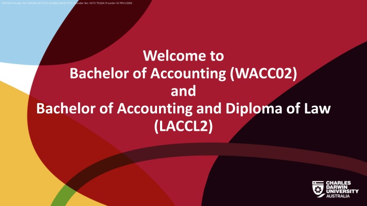 CRICOS Provider No: 00300K (NT/VIC) 03286A (NSW) RTO Provider No: 0373 TEQSA Provider ID PRV12069 Welcome to Bachelor of Accounting (WACC02) and Bachelor of Accounting and Diploma of Law (LACCL2)