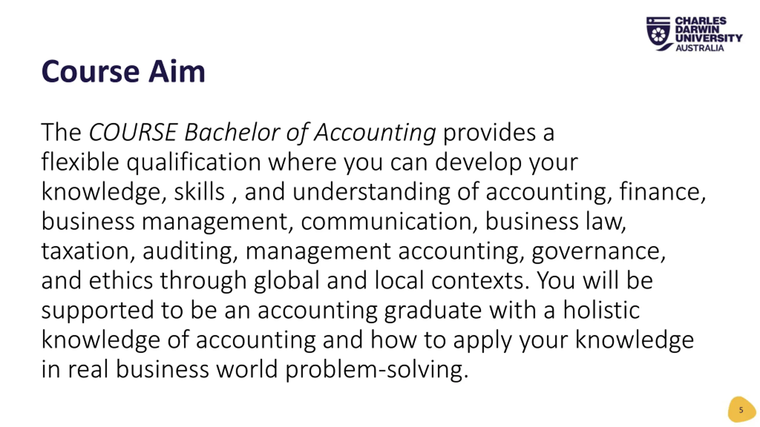 Course Aim The COURSE Bachelor of Accounting provides a flexible qualification where you can develop your knowledge, skills , and understanding of accounting, finance, business management, communication, business law, taxation, auditing, management accounting, governance, and ethics through global and local contexts. You will be supported to be an accounting graduate with a holistic knowledge of accounting and how to apply your knowledge in real business world problem-solving. 5
