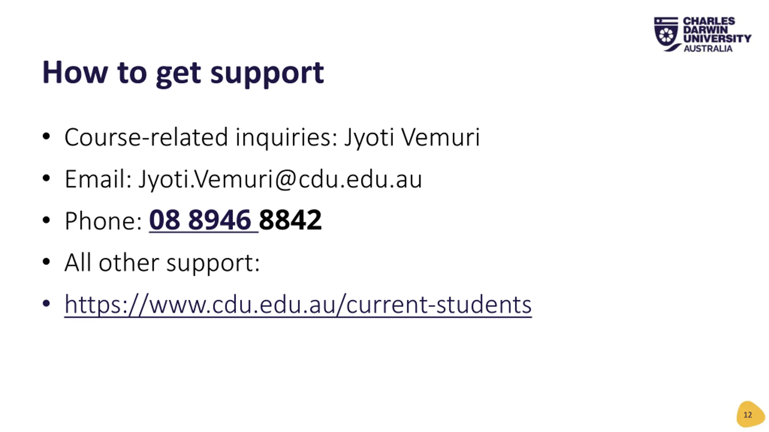 How to get support Course-related inquiries: Jyoti Vemuri Email: Jyoti.Vemuri@cdu.edu.au Phone: 08 8946 8842 All other support: https://www.cdu.edu.au/current-students 12