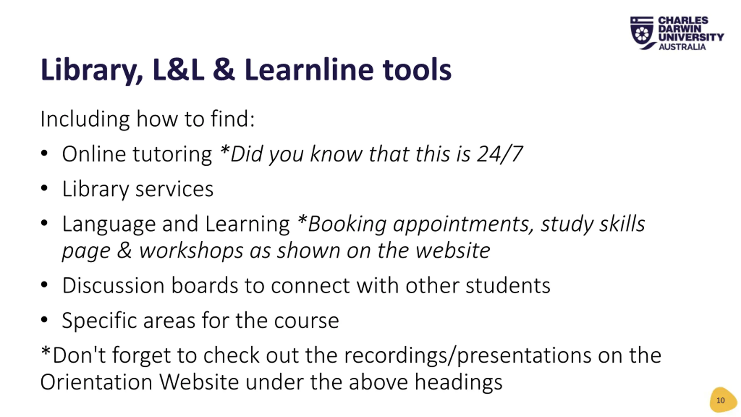 Library, L&L & Learnline tools Including how to find: Online tutoring *Did you know that this is 24/7 Library services Language and Learning *Booking appointments, study skills page & workshops as shown on the website Discussion boards to connect with other students Specific areas for the course *Don't forget to check out the recordings/presentations on the Orientation Website under the above headings 10