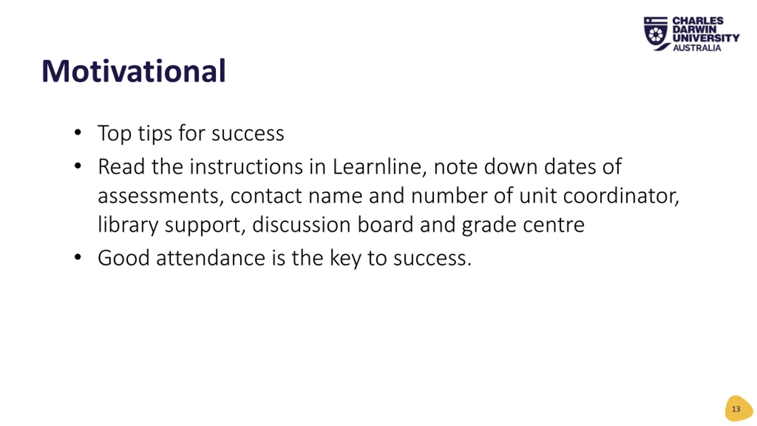 Motivational Top tips for success Read the instructions in Learnline, note down dates of assessments, contact name and number of unit coordinator, library support, discussion board and grade centre Good attendance is the key to success. 13