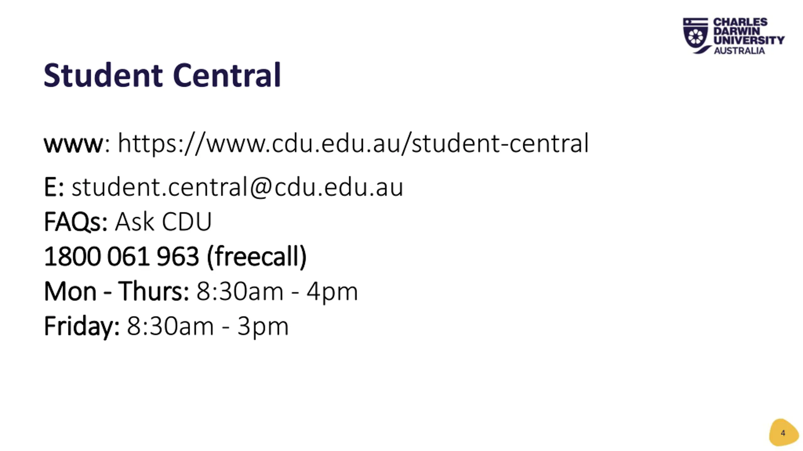 Student Central www www: https://www.cdu.edu.au/student-central E: E: student.central@cdu.edu.au FAQs: FAQs: Ask CDU 1800 1800 061 963 061 963(freecall) (freecall) Mon Mon - - Thurs: Thurs: 8:30am - 4pm Friday: Friday: 8:30am - 3pm 4
