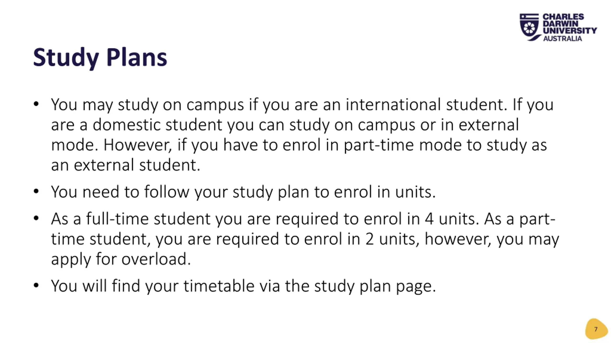 Study Plans You may study on campus if you are an international student. If you are a domestic student you can study on campus or in external mode. However, if you have to enrol in part-time mode to study as an external student. You need to follow your study plan to enrol in units. As a full-time student you are required to enrol in 4 units. As a part- time student, you are required to enrol in 2 units, however, you may apply for overload. You will find your timetable via the study plan page. 7